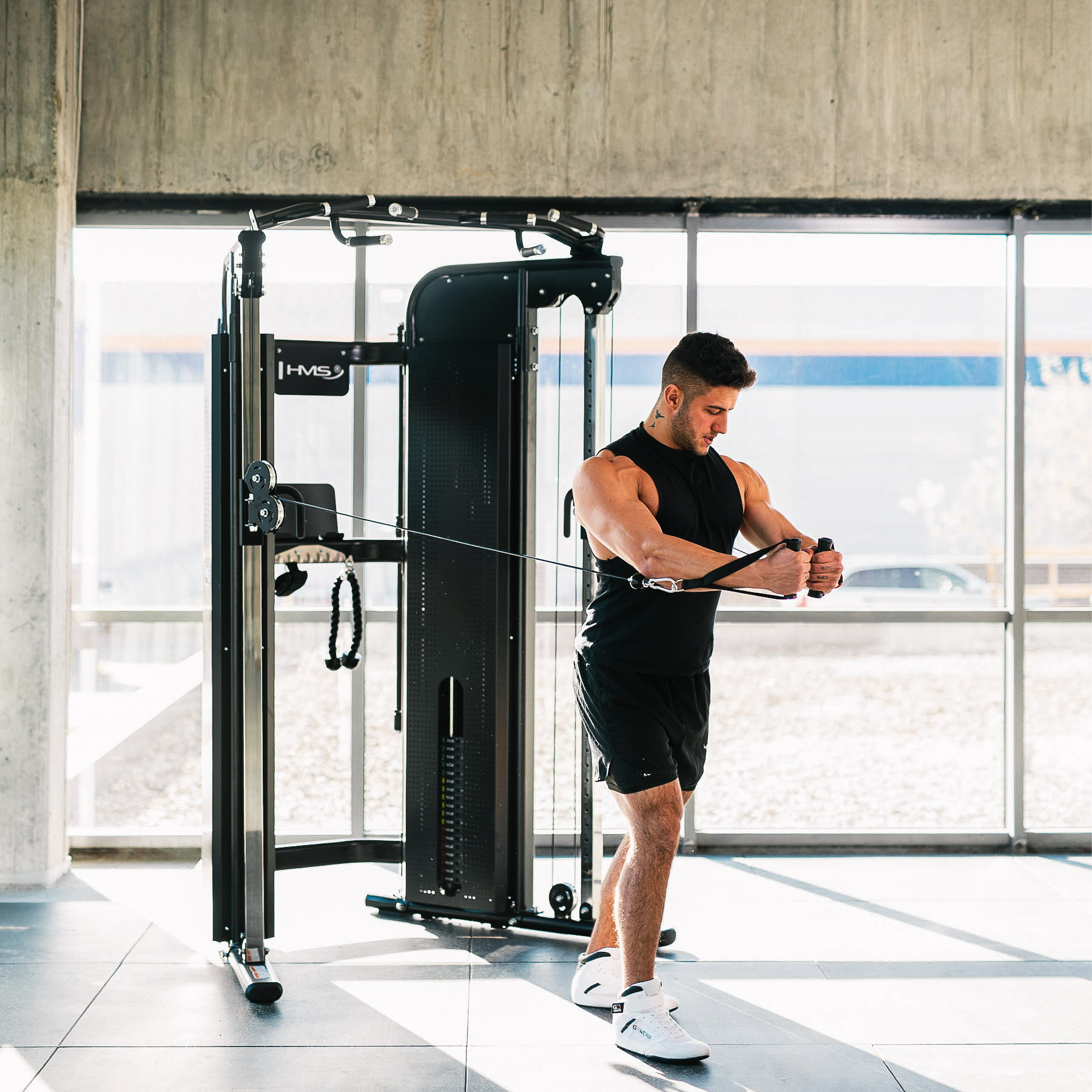 Bramę treningową wyposażono w dwa niezależne stosy obciążeń, każdy o wadze 90 kg. Magnetyczne piny pozwalają na szybkie i precyzyjne dopasowanie obciążenia, a wysokiej jakości linki oraz aluminiowe bloczki zapewniają płynność pracy nawet podczas dynamicznych treningów.