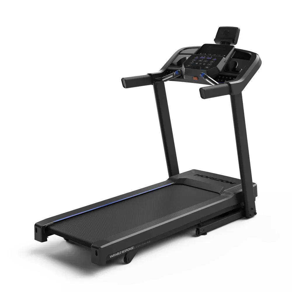 Bieżnia elektryczna Horzion Fitness z dostępem do aplikcji treningowej oraz składanym blatem.