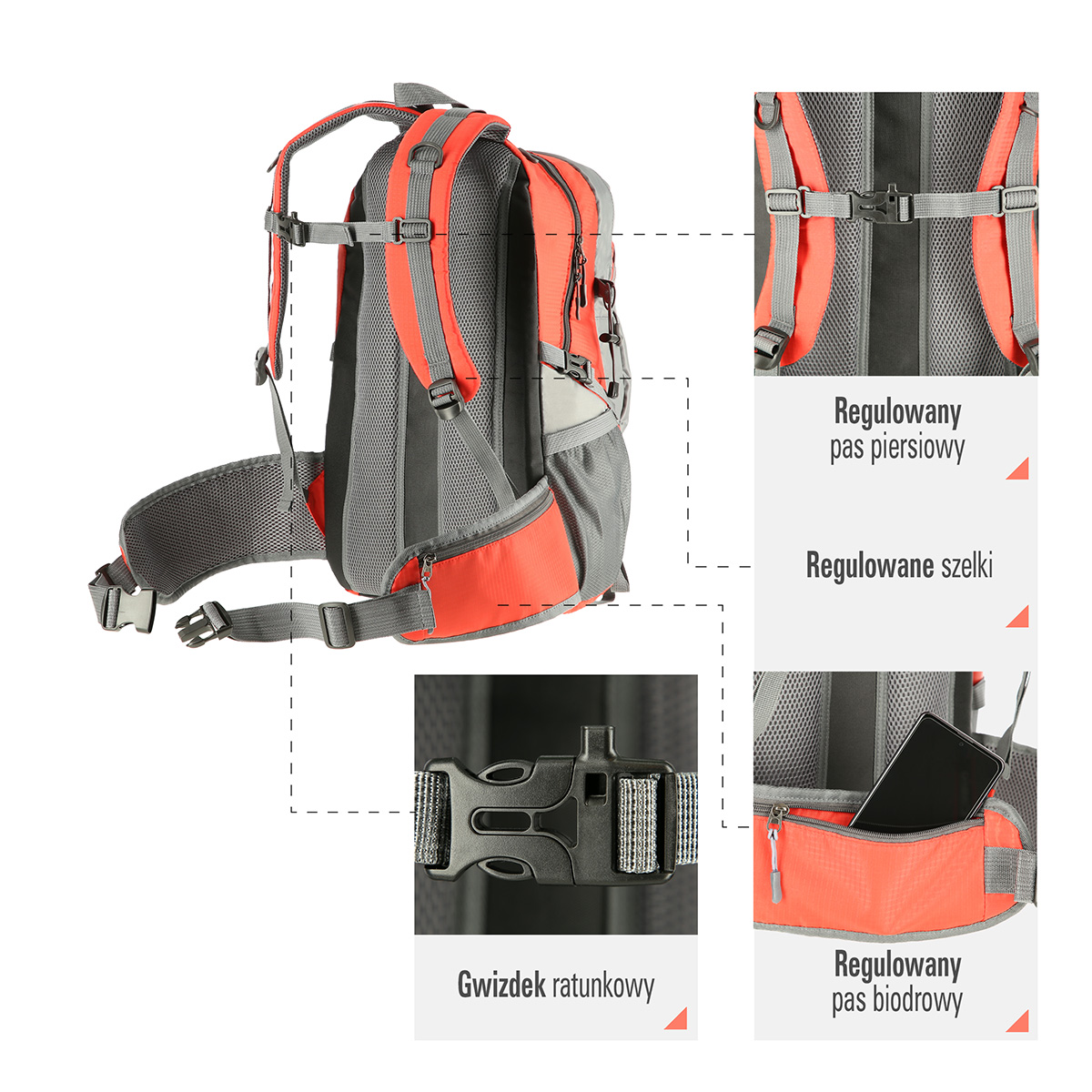Plecak wyposażony jest w pas biodrowy oraz piersiowy, który odciąża nasz kręgosłup, co znacznie poprawia komfort użytkowania i ogranicza wystąpienie dolegliwości w plecach. Dodatkowo model JAGERFLY posiada boczne i dolne pasy kompresyjne, dzięki którym możemy zmniejszyć lub zwiększyć pojemność plecaka