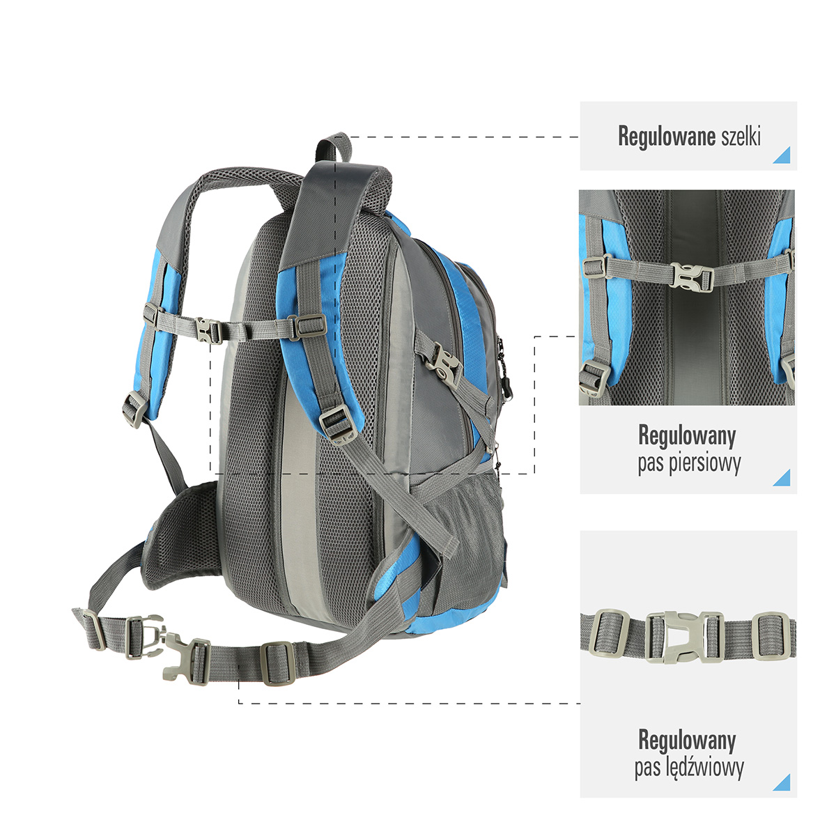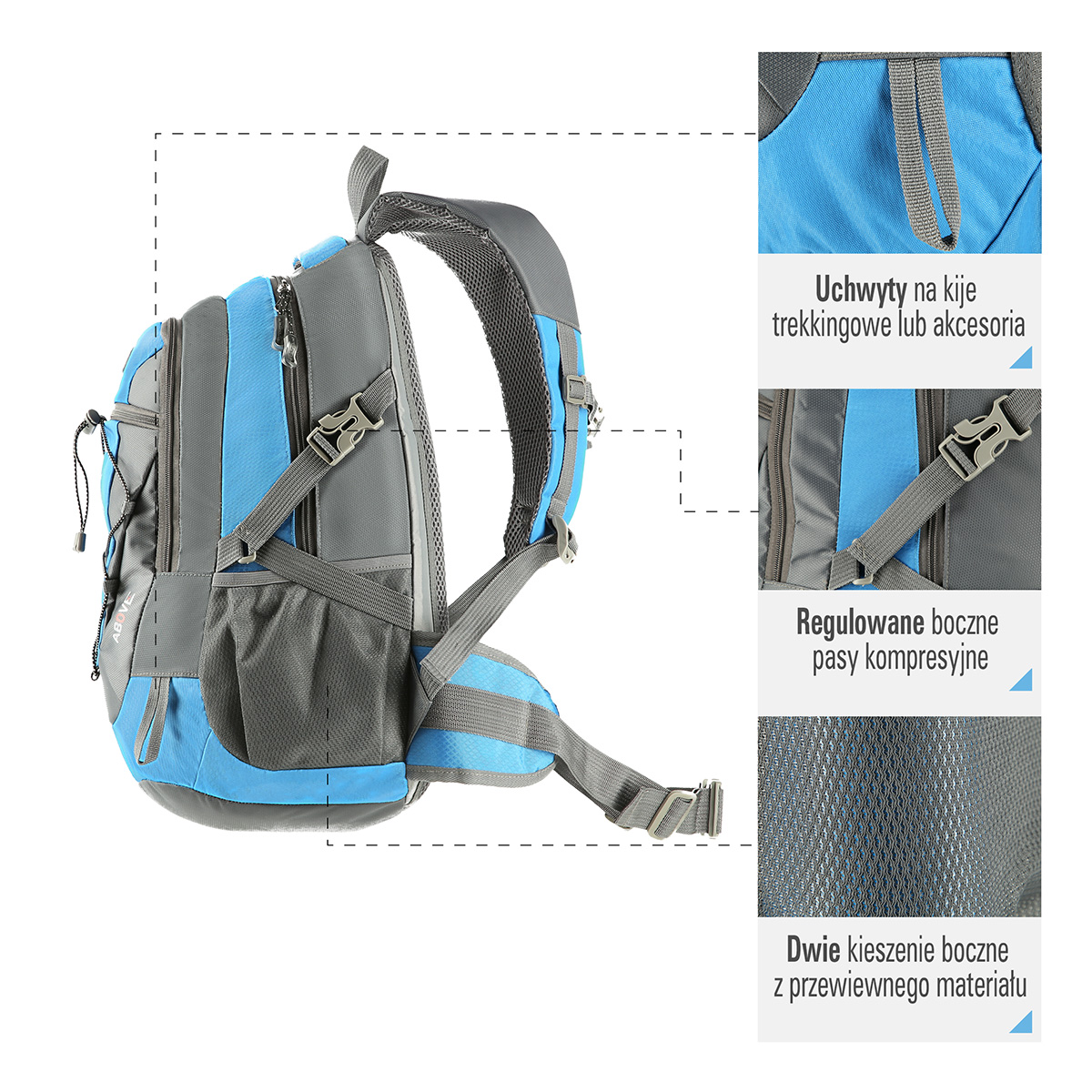Plecak wyposażony jest w pas biodrowy oraz piersiowy, który odciąża nasz kręgosłup, co znacznie poprawia komfort użytkowania i ogranicza wystąpienie dolegliwości w plecach. Dodatkowo model ABOVE posiada boczne pasy kompresyjne, dzięki którym możemy zmniejszyć lub zwiększyć pojemność plecaka