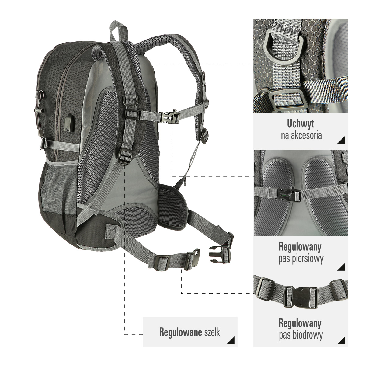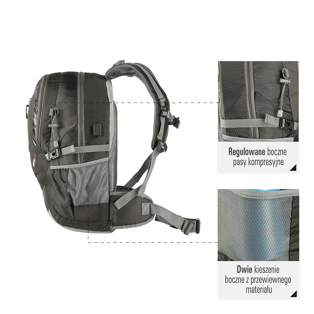– Plecak wyposażony jest w pas biodrowy oraz piersiowy, który odciąża nasz kręgosłup, co znacznie poprawia komfort użytkowania i ogranicza wystąpienie dolegliwości w plecach. Dodatkowo model QUEST posiada boczne pasy kompresyjne, dzięki którym możemy zmniejszyć lub zwiększyć pojemność plecaka