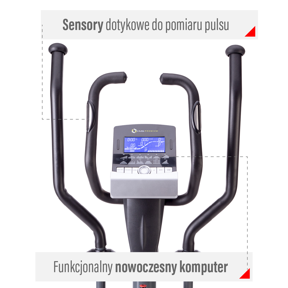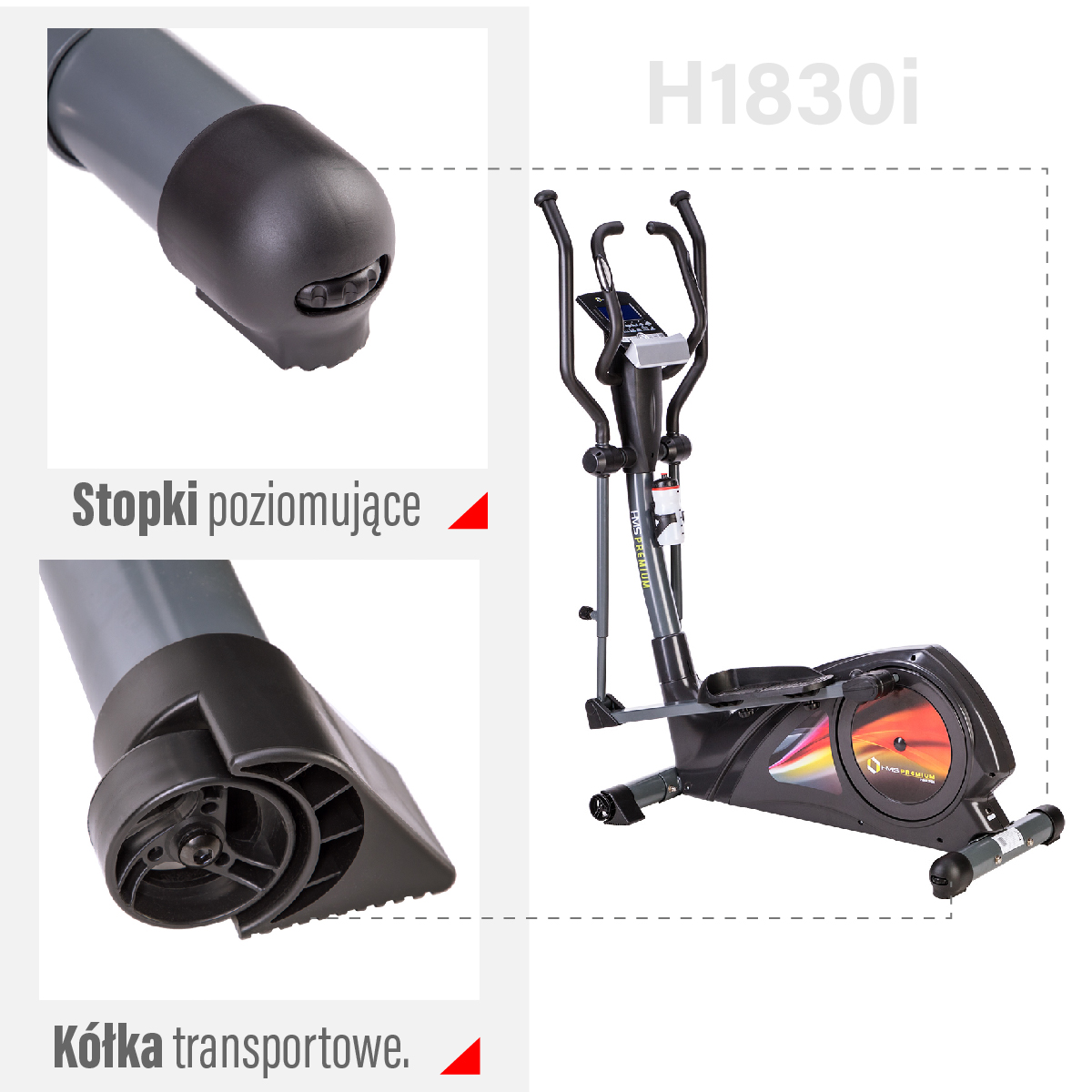 H1830i HMS to trenażer eliptyczny magnetyczny, wyposażony w innowacyjny komputer z możliwością podłączenia telefonu lub tabletu działającym w systemie Android lub iOS. Dzięki temu użytkownik uzyskuje dostęp do bezpłatnej aplikacji iConsole+training. Software gromadzi wszystkie niezbędne dane dotyczące treningu. Trenażer eliptyczny H1830i HMS należy do ekskluzywnej serii HMS Premium. Urządzenie charakteryzuje się najwyższą jakością połączoną z najlepszymi walorami użytkowymi. Każdy podzespół oraz element wykończenia został dokładnie zaprojektowany, a następnie precyzyjnie wykonany. Jednym z atutów trenażera eliptycznego jest elektroniczna regulacja obciążenia, dzięki której użytkownik nie musi odrywać się od treningu w celu zmiany ustawień. H1830i oferuje niepowtarzalne wrażenia z treningów, gwarantując komfort i bezpieczeństwo. Trenażer eliptyczny marki HMS to również szereg udogodnień. Są to m.in.: technologia Bluetooth, sensory dotykowe do precyzyjnego mierzenia pulsu oraz uchwyt na urządzenie mobilne. Wygodę użytkownika zapewnia wielofunkcyjna konsola centralna z dotykowym wyświetlaczem.