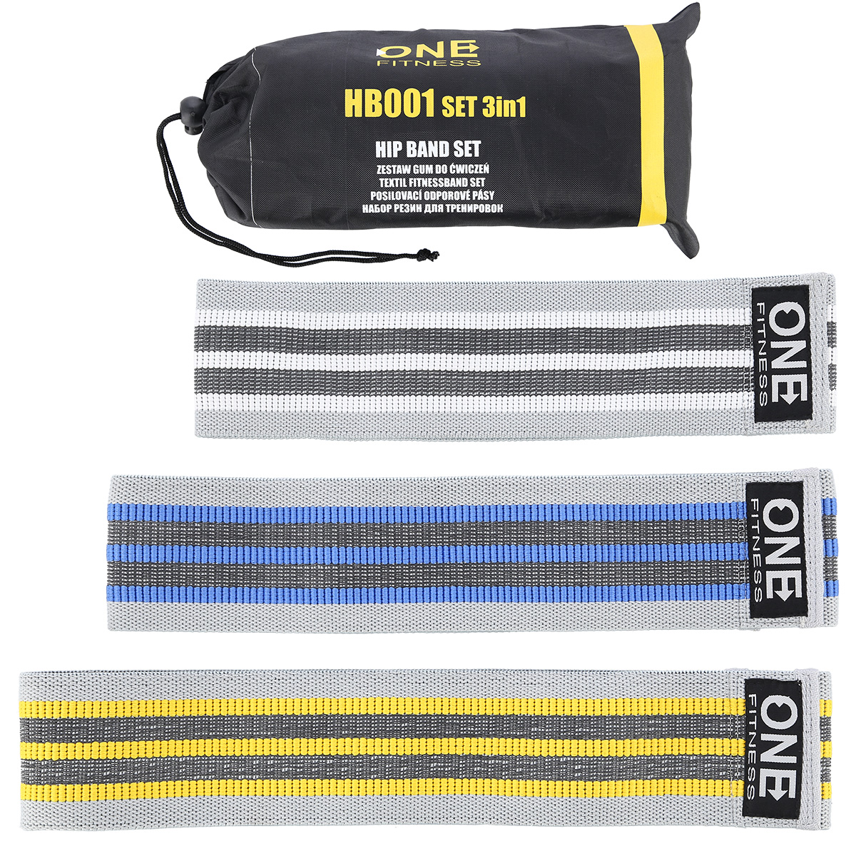 HB001 SET 3w1 ONE FITNESS to zestaw trzech gum typu hip band. Ich główne zastosowanie, to ćwiczenia rozwijające mięśnie pośladków i całą grupę mięśni ud. Mogą być wykorzystywane, jako samodzielny sprzęt treningowy i wykonamy, przy ich użyciu pełny trening, dolnych partii mięśniowych. Dodatkowo, użycie HB001 sprawi, że ćwiczenia wykonywane z innymi przyrządami, wejdą na wyższy poziom trudności. Do takich ćwiczeń, należą np. przysiady ze sztangą. Przy każdym powtórzeniu, do pracy mięśni czworogłowych, dwugłowych i pośladkowych, dzięki gumom dodajemy również pracę mięśni przywodzicieli.