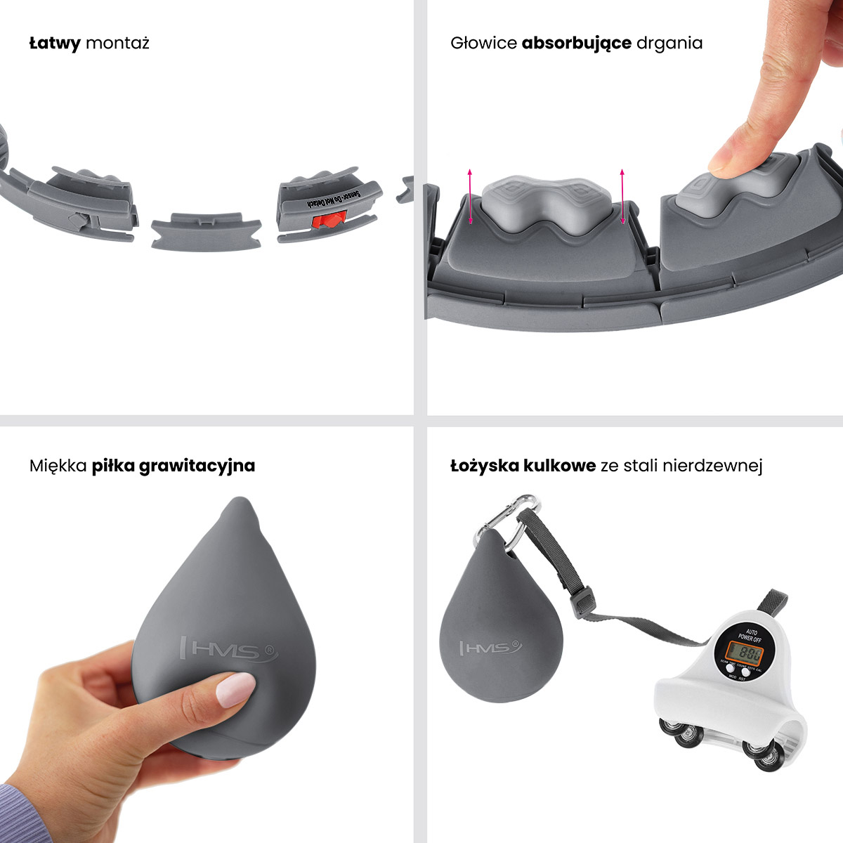 HHW06 HMS to regulowany hula-hoop z absorbującymi drgania wypustkami i piłką grawitacyjną do fitnessu. Pozwala na jednoczesny trening i masaż talii 360 stopni. Jest perfekcyjny m.in. do wzmocnienia i ujędrnienia gorsetu mięśniowego. Dzięki regulacji obwodu HHW06 nigdy nie spadnie podczas ćwiczeń, dzięki czemu domowy trening cardio może być długi i przyjemny, co jest gwarancją jeszcze szybszych i lepszych efektów! Urządzenie dedykowane jest zarówno dla dzieci oraz dorosłych.