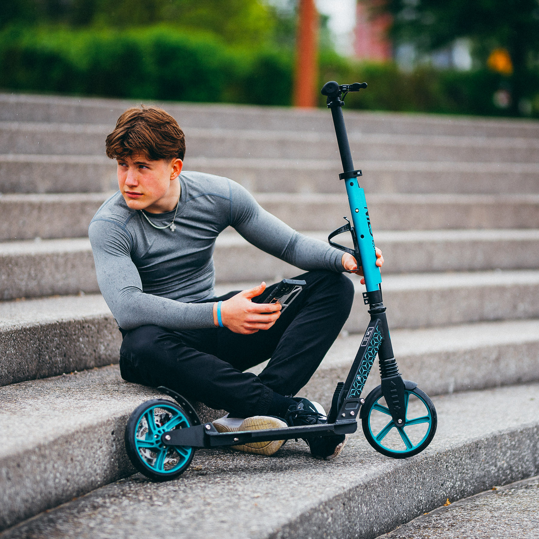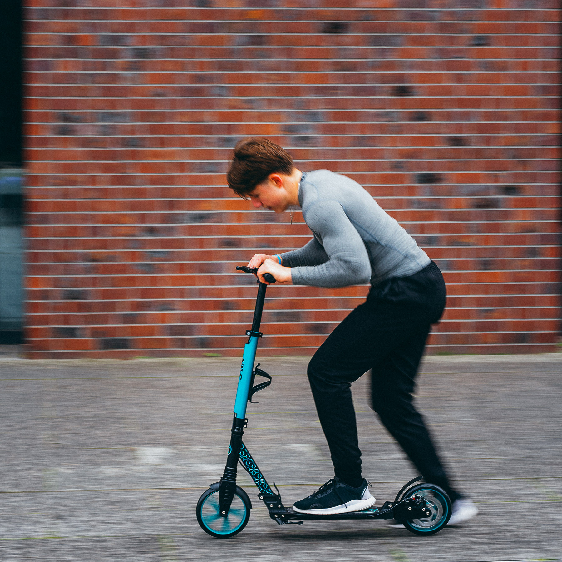 Dzięki zastosowaniu dużych, poliuretanowych kółek o średnicy 200 mm oraz wysokiej klasy łożysk ABEC 7, hulajnoga zapewnia niezwykle płynną jazdę. Doskonale sprawdza się na asfalcie oraz wybrukowanych chodnikach, gwarantując komfort i minimalizując drgania nawet na nierównych nawierzchniach.