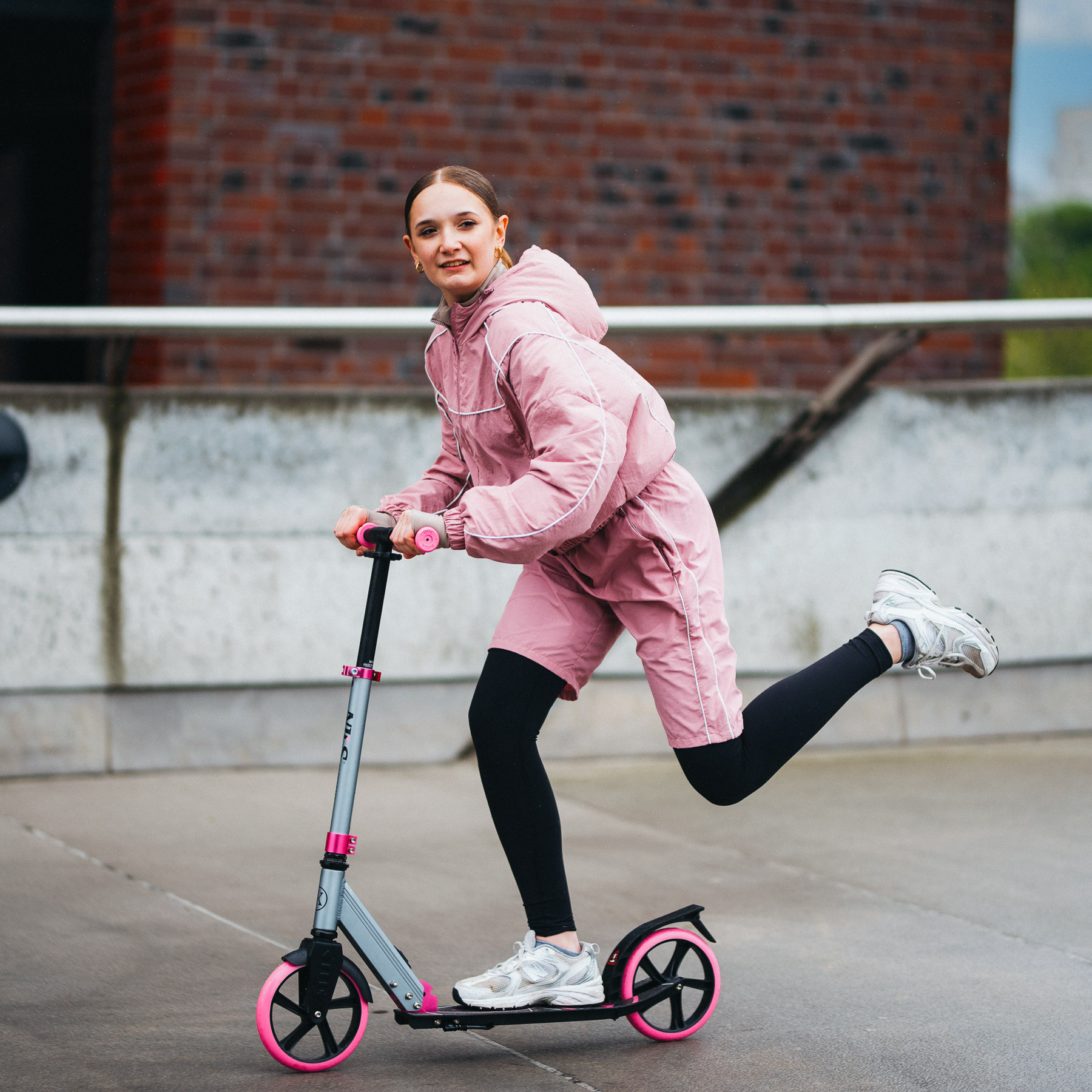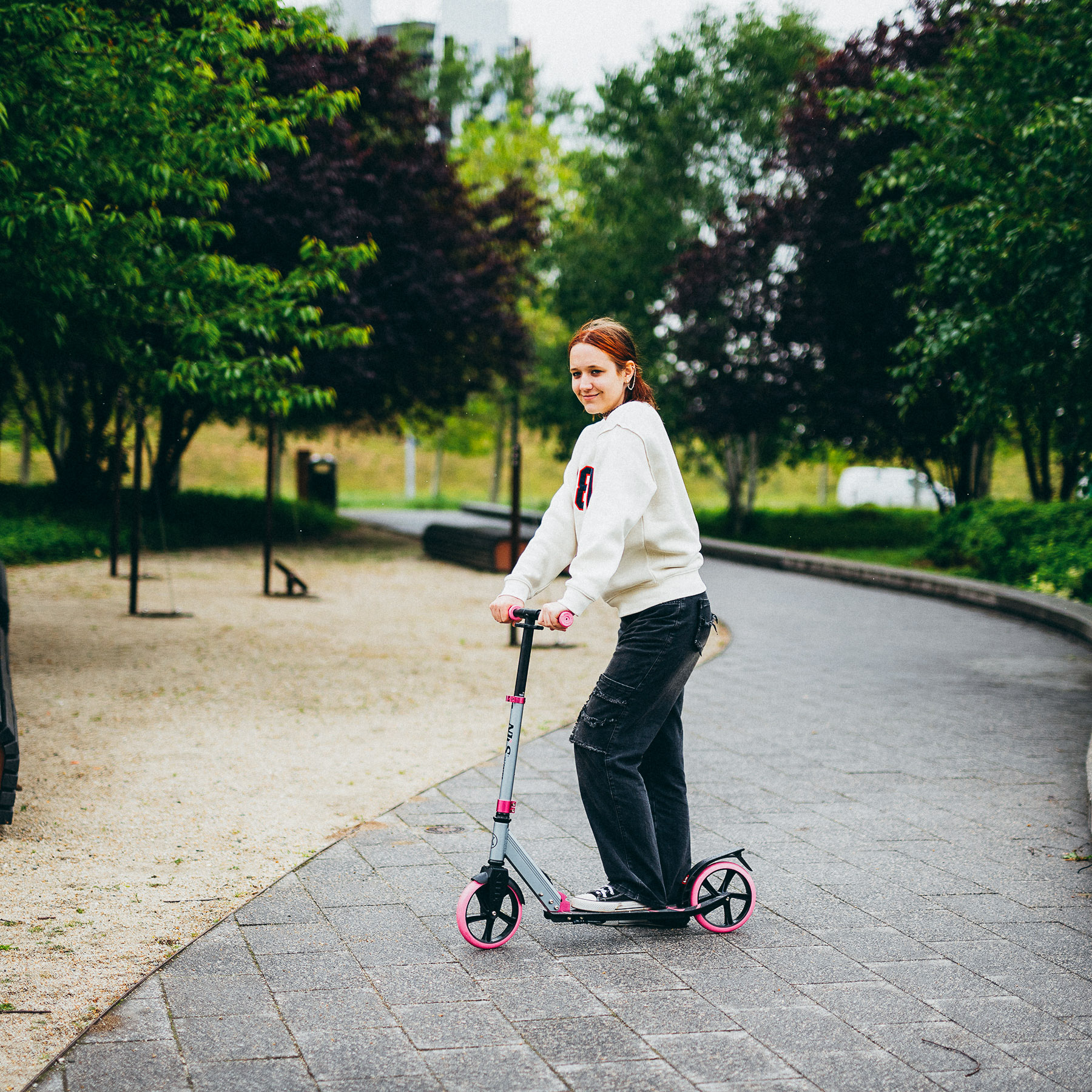 Dzięki zastosowaniu dużych, poliuretanowych kółek o średnicy 200 mm oraz wysokiej klasy łożysk ABEC 7, hulajnoga zapewnia płynną jazdę nawet po nierównych nawierzchniach. Doskonale sprawdzi się zarówno na asfalcie, jak i wybrukowanych chodnikach, gwarantując komfort i minimalizując drgania.
