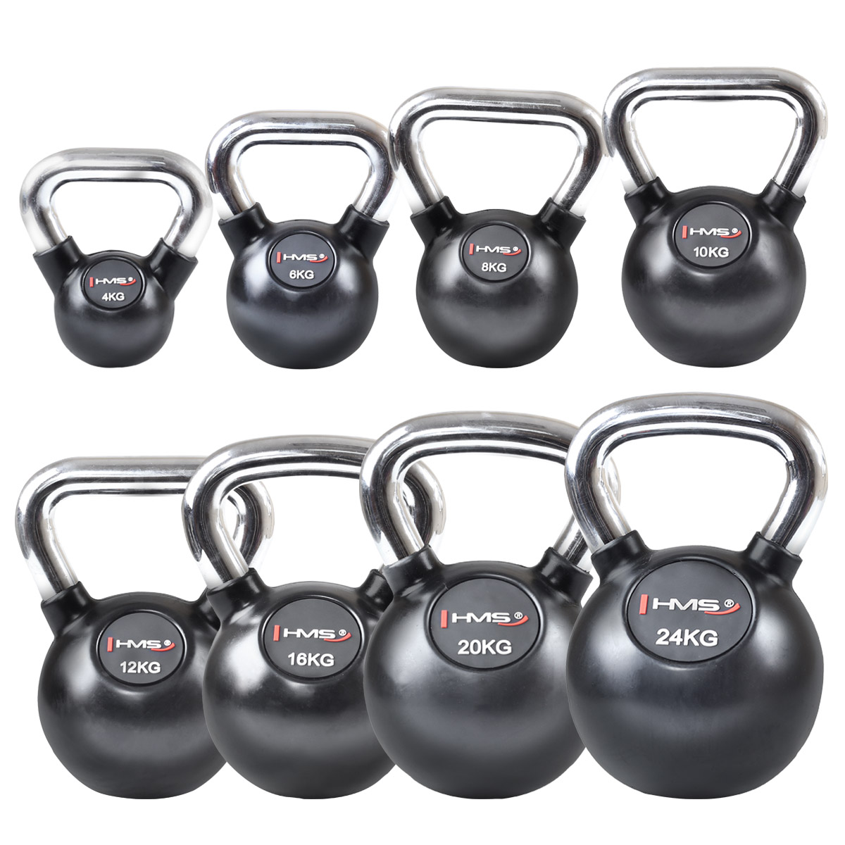 KGC20 HMS kettlebell – żeliwny ciężar pokryty gumą. Jego główne atuty to chromowany uchwyt, idealny odlew i estetyczne wykończenie.