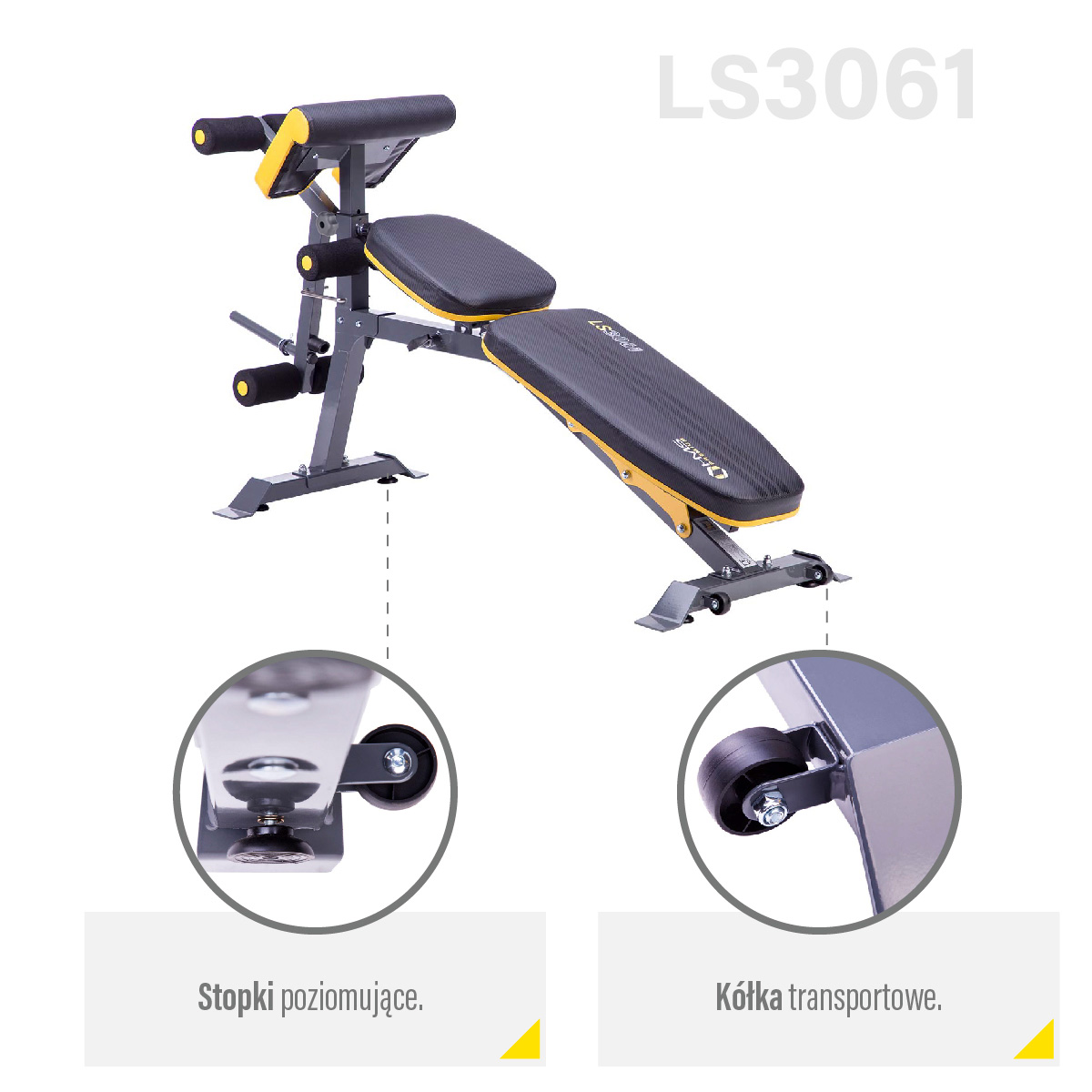 Ławeczka daje mnóstwo możliwości ćwiczeniowych. Jej budowa sprawia, że idealnie sprawdzi się ze stojakiem na sztangę, jak również do treningu z hantlami. Zakres regulacji kąta nachylenia oparcia, pozwoli w pełni rozwinąć ćwiczony mięsień. Możliwe jest wykonanie ćwiczeń na klatkę piersiową oraz barki. Ustawienie ławeczki skośnie w dół, pozwoli wykonać skłony czyli tzw. brzuszki. Uchwyt na nogi zagwarantuje wygodę i bezpieczeństwo podczas wykonywania tego ćwiczenia, angażującego mięśnie brzucha. Nie zapominajmy, że ławka posiada modlitewnik, powiększa to wachlarz możliwości ćwiczeniowych, o trening bicepsów. Wymontowując modlitewnik, zyskujemy możliwość wykonania treningu nóg. Na prasie do nóg możemy wykonać ćwiczenia mięśni czworogłowych uda. Ustawiając ławkę w pozycji poziomej, kładąc się na brzuchu i zahaczając stopy o uchwyt, wykonany uginanie nóg z obciążeniem, angażując tym samym mięsnie dwugłowe uda.