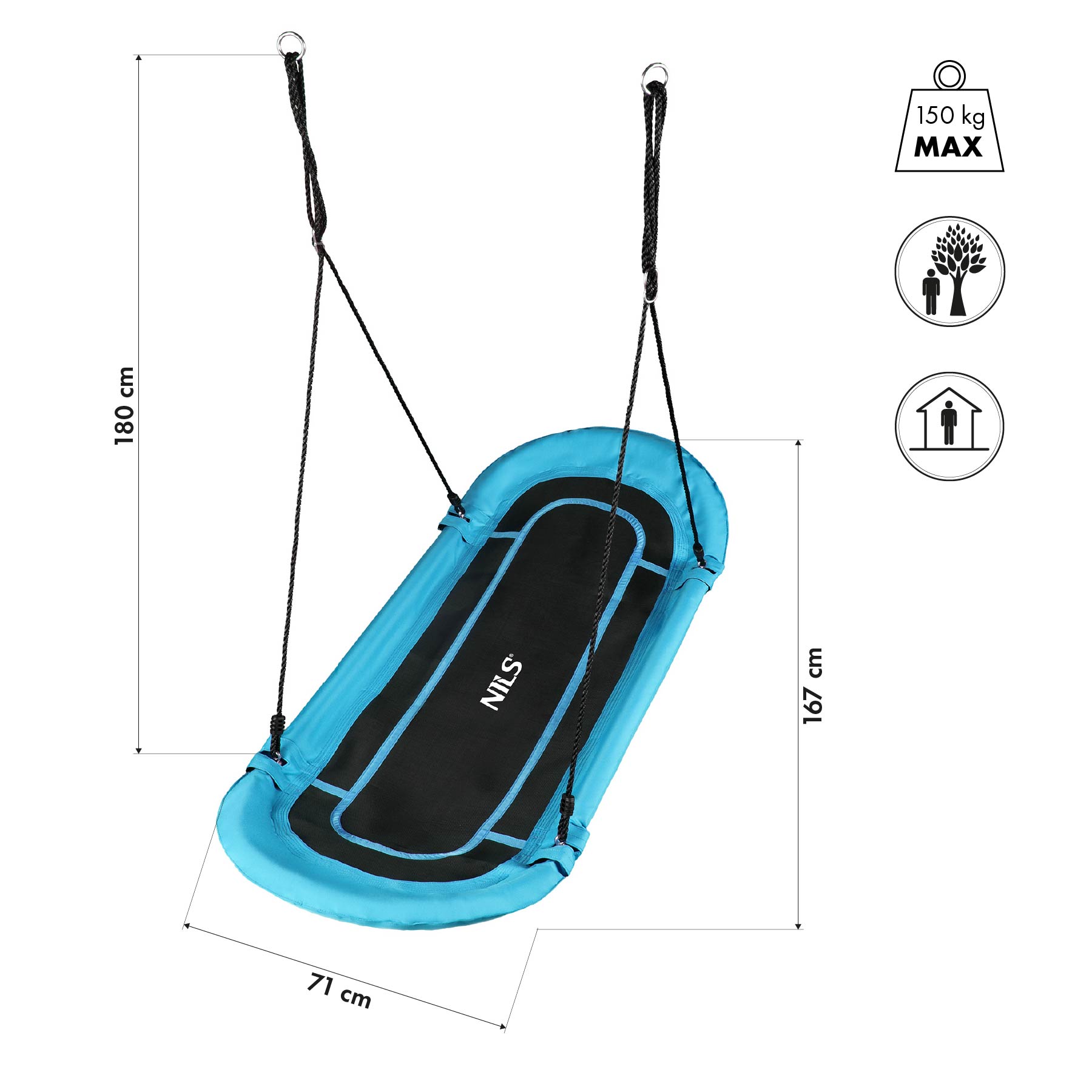 W przeciwieństwie do klasycznych huśtawek o okrągłym siedzisku, NB5044 oferuje owalną powierzchnię o wymiarach 167 × 71 cm. Taka konstrukcja daje więcej możliwości: dzieci mogą się wygodnie położyć, a nawet korzystać z niej w kilka osób jednocześnie. Dzięki solidnej stalowej ramie o średnicy 25 mm i grubości 1,4 mm, huśtawka zachowuje stabilność nawet przy maksymalnym obciążeniu.