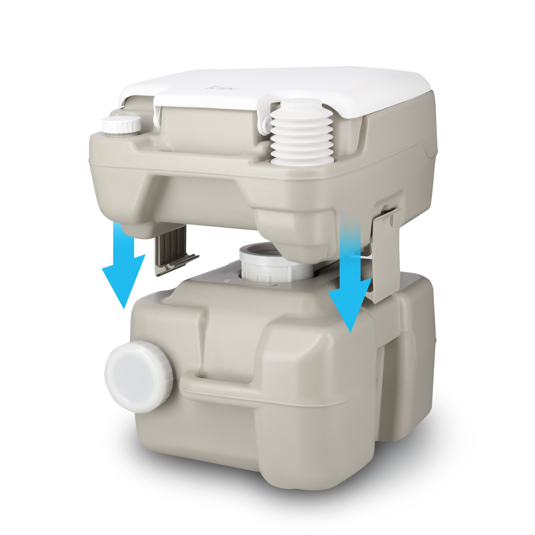 Model NC0025 składa się z dwóch oddzielnych zbiorników: na czystą wodę (10 litrów) oraz na nieczystości (20 litrów). Dzięki temu jest w pełni niezależna od podłączenia do bieżącej wody. System spłukiwania oparty jest na ręcznej pompce mieszkowej, która w połączeniu z dyszą typu „T” skutecznie rozprowadza wodę po całej misie, zapewniając dokładne i równomierne oczyszczanie po każdym użyciu. Zastosowany zawór suwakowy skutecznie oddziela zbiorniki i zapobiega wydostawaniu się nieprzyjemnych zapachów.