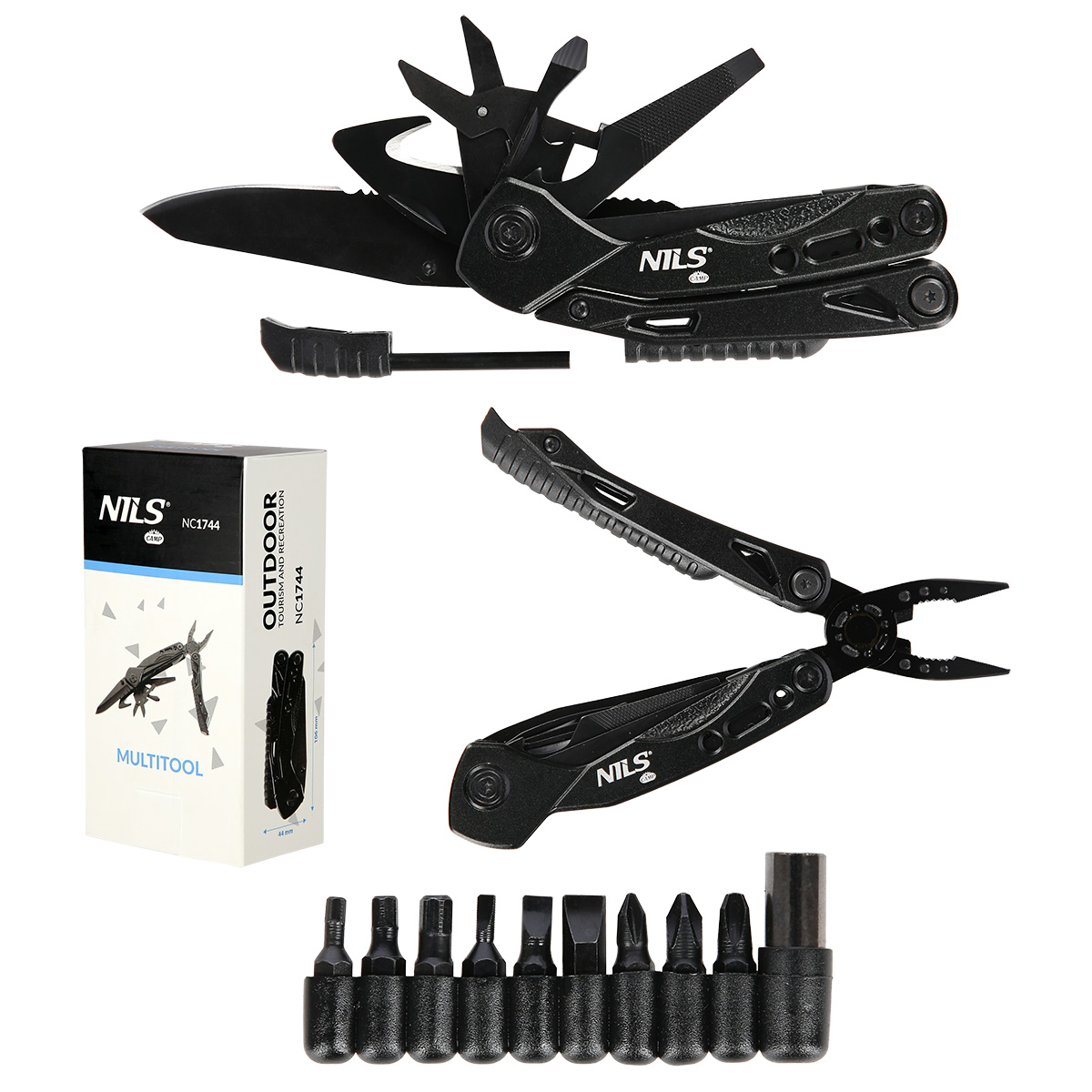 Multitool NC1744 marki NILS CAMP to wielofunkcyjny zestaw narzędzi dla majsterkowiczów, wędkarzy czy jako dodatkowe wyposażenie w domu lub w samochodzie. NC1744 posiada 12 niezbędnych narzędzi, które ułatwią funkcjonowanie podczas wypadów turystycznych oraz codziennych czynności. Produkt został wykonany ze stali nierdzewnej, dzięki czemu jest bardzo praktyczny i trwały. Dodatkowo w zestawie znajduje się zestaw 9 różnych bitów oraz zamykane etui z opcją powieszenia przy pasku.