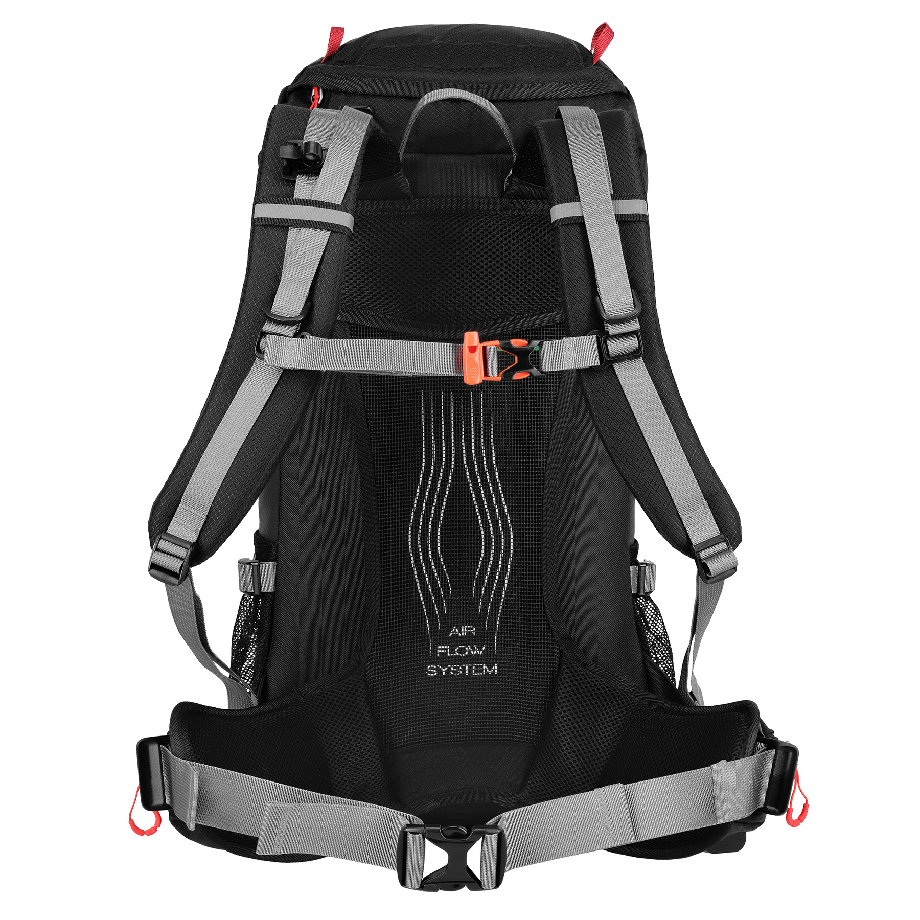 Na klamrze spinającej pas piersiowy umieszczono zintegrowany gwizdek ratunkowy, zwiększający bezpieczeństwo użytkownika. Dodatkowy panel uchwytów pozwala na zamocowanie np. kijków trekkingowych lub innych akcesoriów. Plecak posiada również dwie kieszenie boczne z siatki oraz kieszenie na zamek w pasie biodrowym, idealne na telefon czy inne drobne przedmioty.