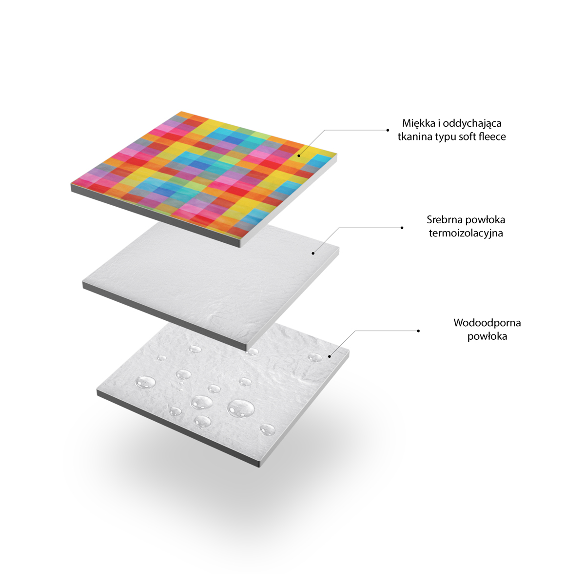 Koc został wykonany z dwóch warstw materiału. Górna to wysokiej jakości pianka, cechująca się miękkością i dobrą ochroną przed chłodniejszym podłożem, co zdecydowanie poprawia komfort użytkowania. Na dolnej części, umieszczono powłokę aluminium, które jest wodoodporne i pozwala użyć koca np. na wilgotnym piasku, czy trawie pokrytej rosą. W połączeniu, oba te materiały, tworzą świetną warstwę termoizolacyjną.