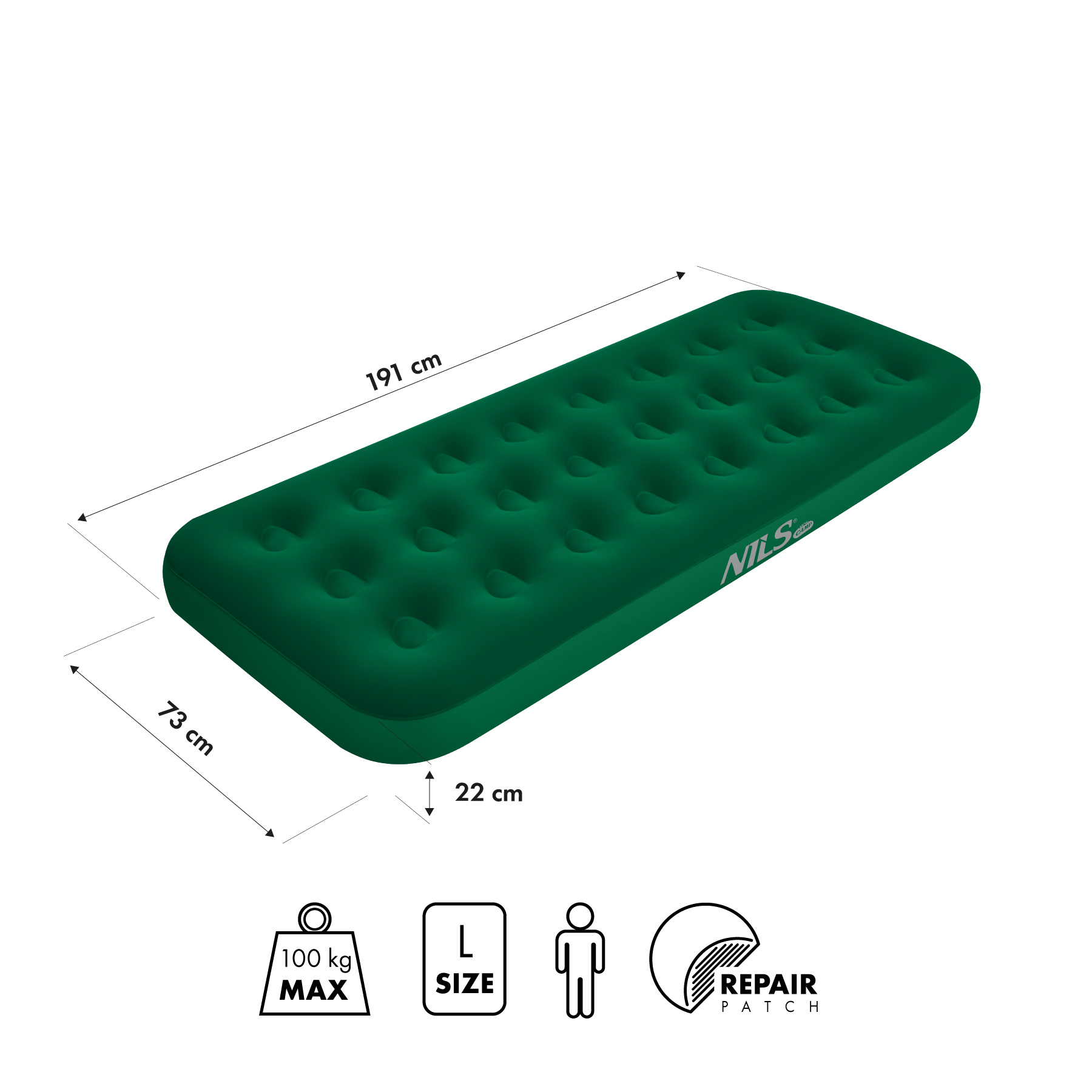Antypoślizgowe wykończenie materaca zapewnia stabilność nawet podczas zmiany pozycji w trakcie snu. Dzięki dopuszczalnemu obciążeniu do 120 kg mogą z niego korzystać osoby o różnej budowie ciała. Wysokość 22 cm zwiększa komfort użytkowania – zapewnia odpowiednią izolację od podłoża, co jest szczególnie istotne podczas korzystania na zewnątrz.