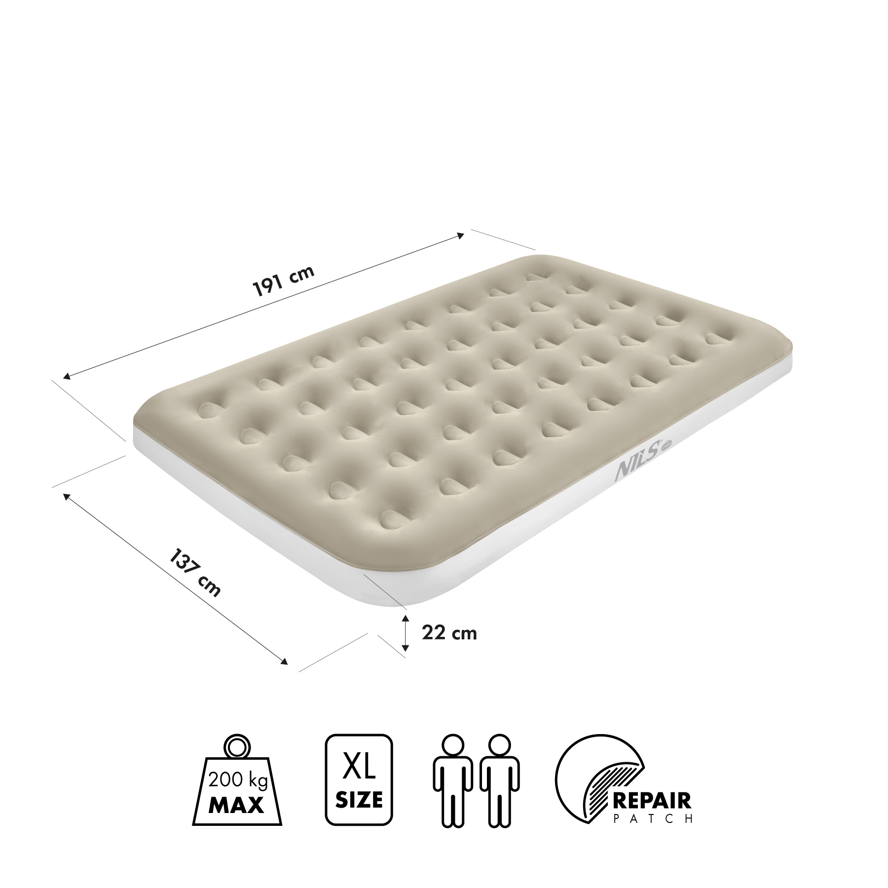 Dzięki wymiarom 191 × 137 × 22 cm, materac oferuje powierzchnię odpowiadającą standardowemu łóżku dwuosobowemu. To idealne rozwiązanie dla par, ale również dla jednej osoby, która ceni sobie dużą przestrzeń do spania. Wysokość 22 cm gwarantuje komfortową izolację od podłoża – nie tylko zwiększając wygodę, ale również poprawiając ochronę przed zimnem i wilgocią przy użytkowaniu na zewnątrz.