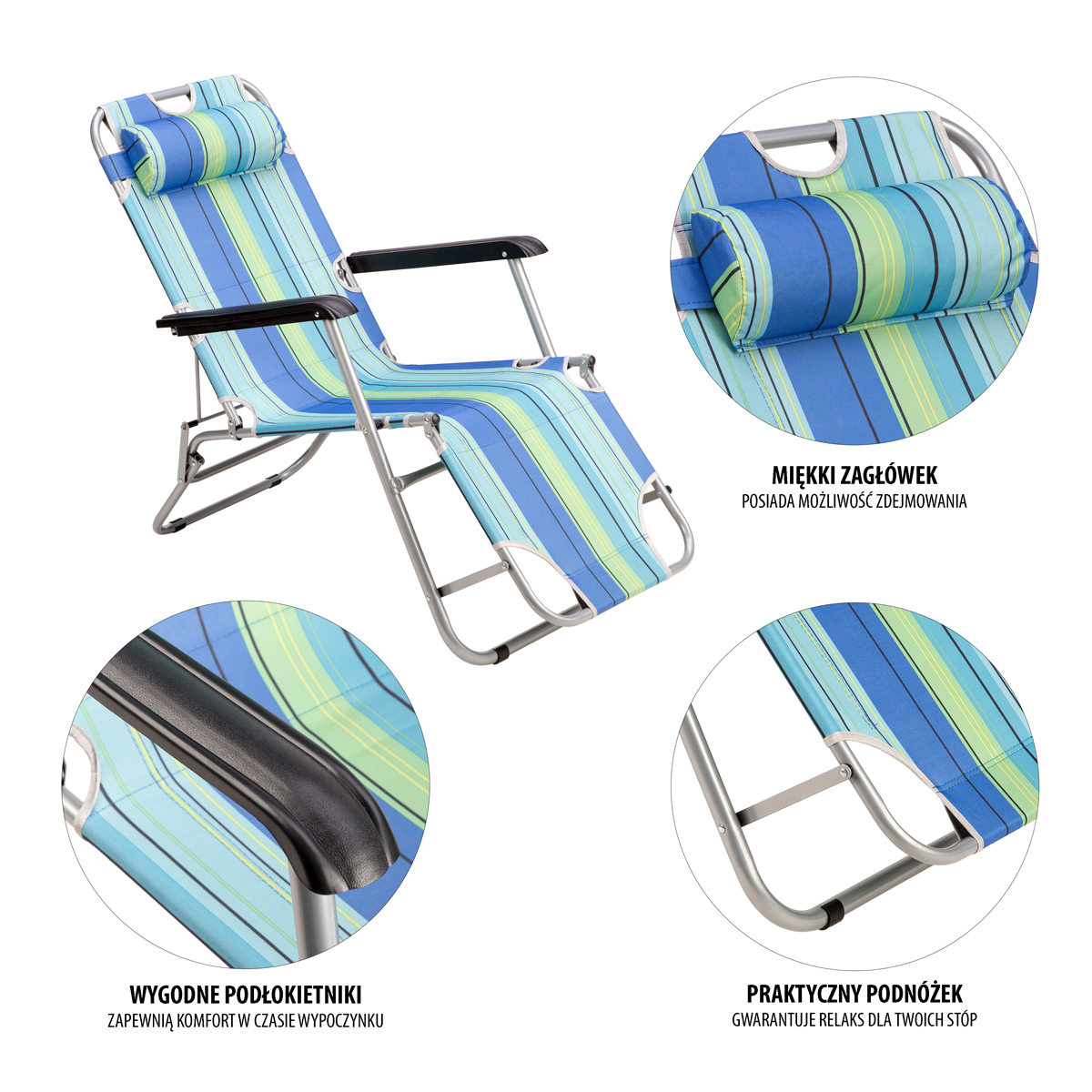 To idealny towarzysz wypraw na plażę, ale oczywiście sprawdzi się również, w ogrodzie czy na campingu. To uniwersalny leżak, który zda egzamin w każdych warunkach i w każdym terenie. NC3024, to model składany, dzięki czemu bez trudu, zabierzemy go ze sobą w podróż. Leżak można ustawić w dwóch pozycjach. Pierwsza z nich, to pozycja leżąca, która daje możliwość opalania się zarówno leżąc na plecach, jak i na brzuchu. Atrakcyjna pozycja, zwłaszcza dla osób nie lubiących leżeć bezpośrednio np. na piasku. Druga pozycja, to pozycja siedząca. Sprawdzi się przy opalaniu, jednak znajdzie swoje zastosowanie, także przy stoliku campingowym. Dopełnieniem komfortu obu tych pozycji jest poduszka, którą można dowolnie przesuwać i dopasować do swoich potrzeb.
