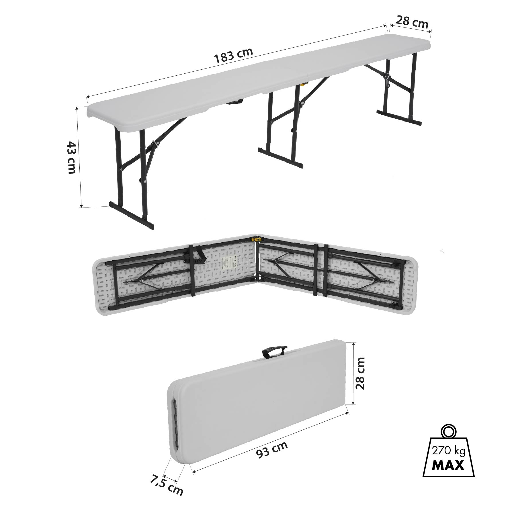 Pomimo niskiej wagi, ława NC3404 charakteryzuje się wyjątkową stabilnością i solidnością. Maksymalne obciążenie aż 270 kg pozwala na bezpieczne użytkowanie przez kilka osób jednocześnie. Z długością 183 cm zapewnia dużo miejsca do siedzenia przy stole, a wysokość 43 cm doskonale współgra ze standardowymi stołami piknikowymi i cateringowymi.