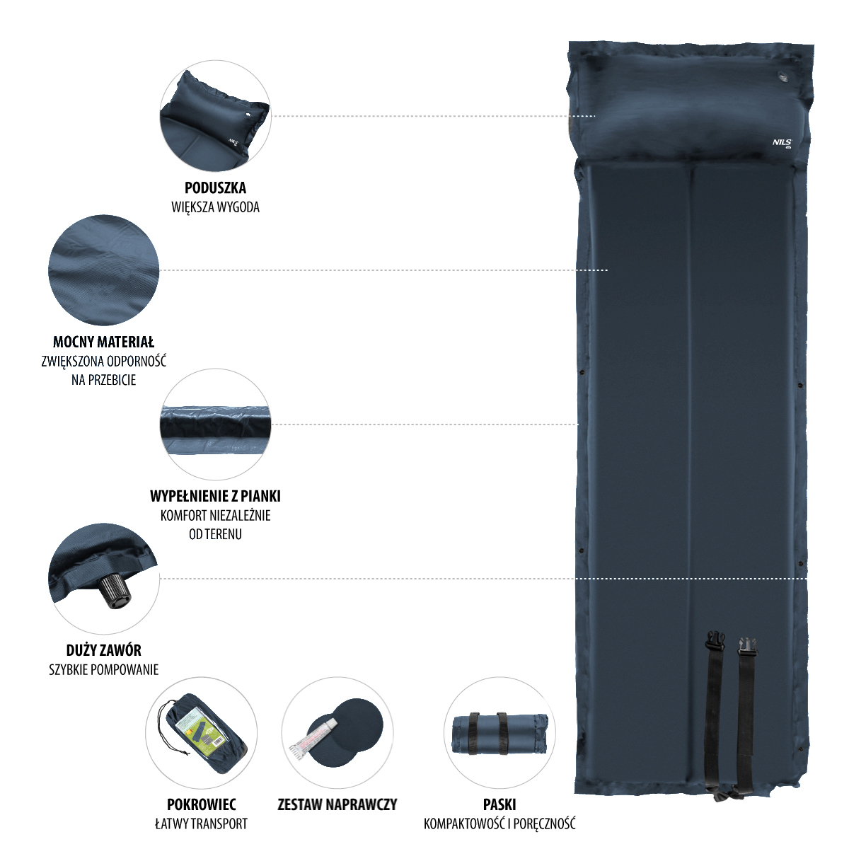 Mata samopompująca z poduszką NC4008 to świetne rozwiązanie dla każdego miłośnika spędzania czasu podczas campingu, pod namiotem czy na plaży!