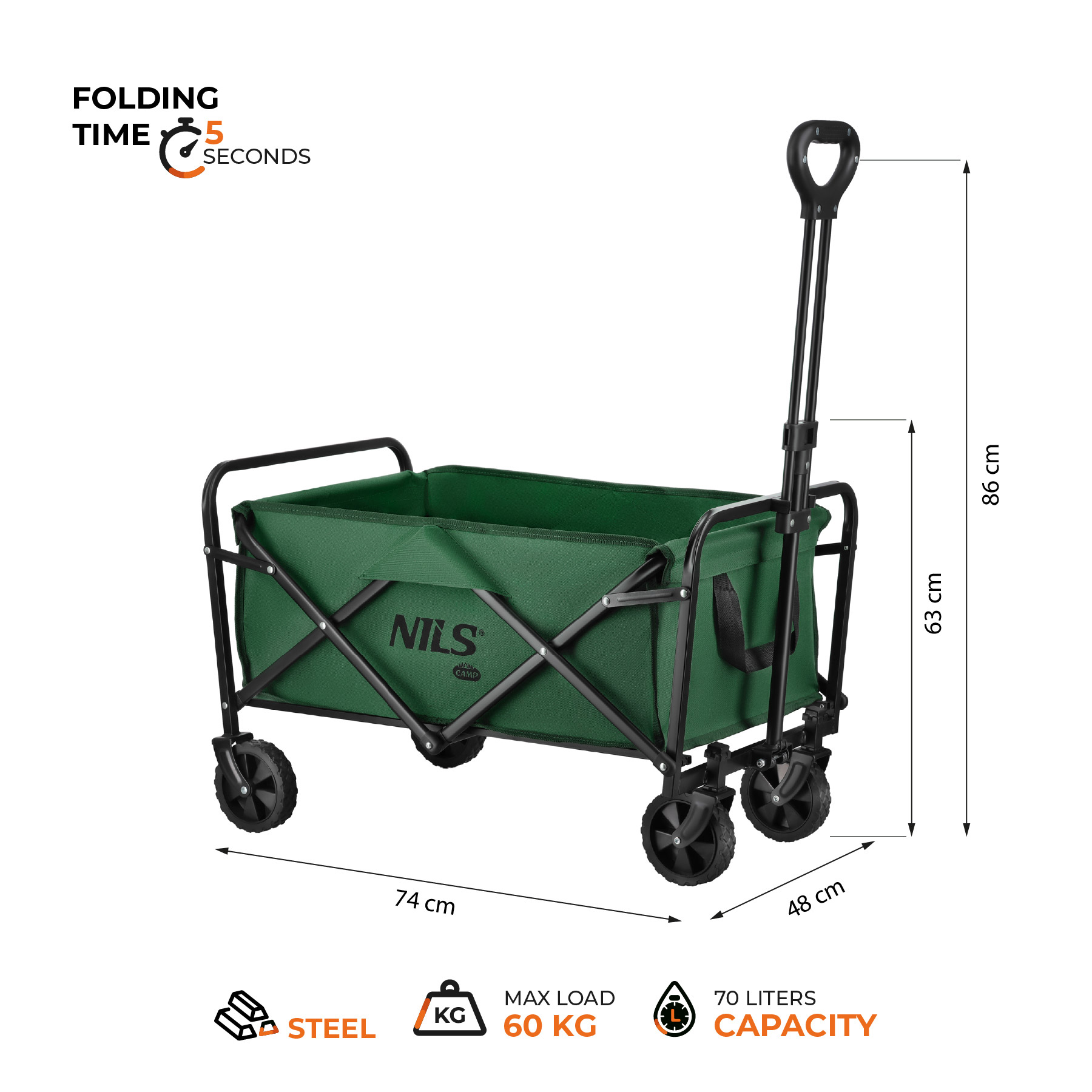 NC4306 WÓZEK TURYSTYCZNY SKŁADANY ZIELONY 70L NILS CAMP to lekki, a jednocześnie solidny wózek, który powstał po to, by odciążyć ręce i uprościć transport ekwipunku w różnych sytuacjach – od wyjazdów i wypadów za miasto, po codzienne sprawunki. Zamiast dźwigać kilka toreb naraz, możesz spakować wszystko w jedno miejsce i ruszyć wygodnie przed siebie. Regulowana rączka ułatwia dopasowanie chwytu do wzrostu oraz stylu prowadzenia, dzięki czemu manewrowanie wózkiem jest naturalne i komfortowe.