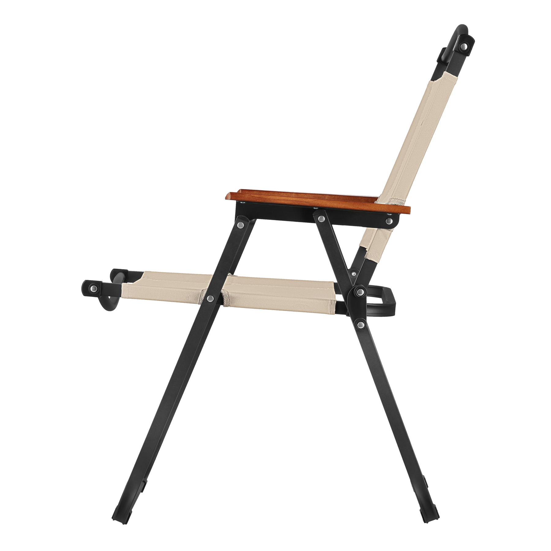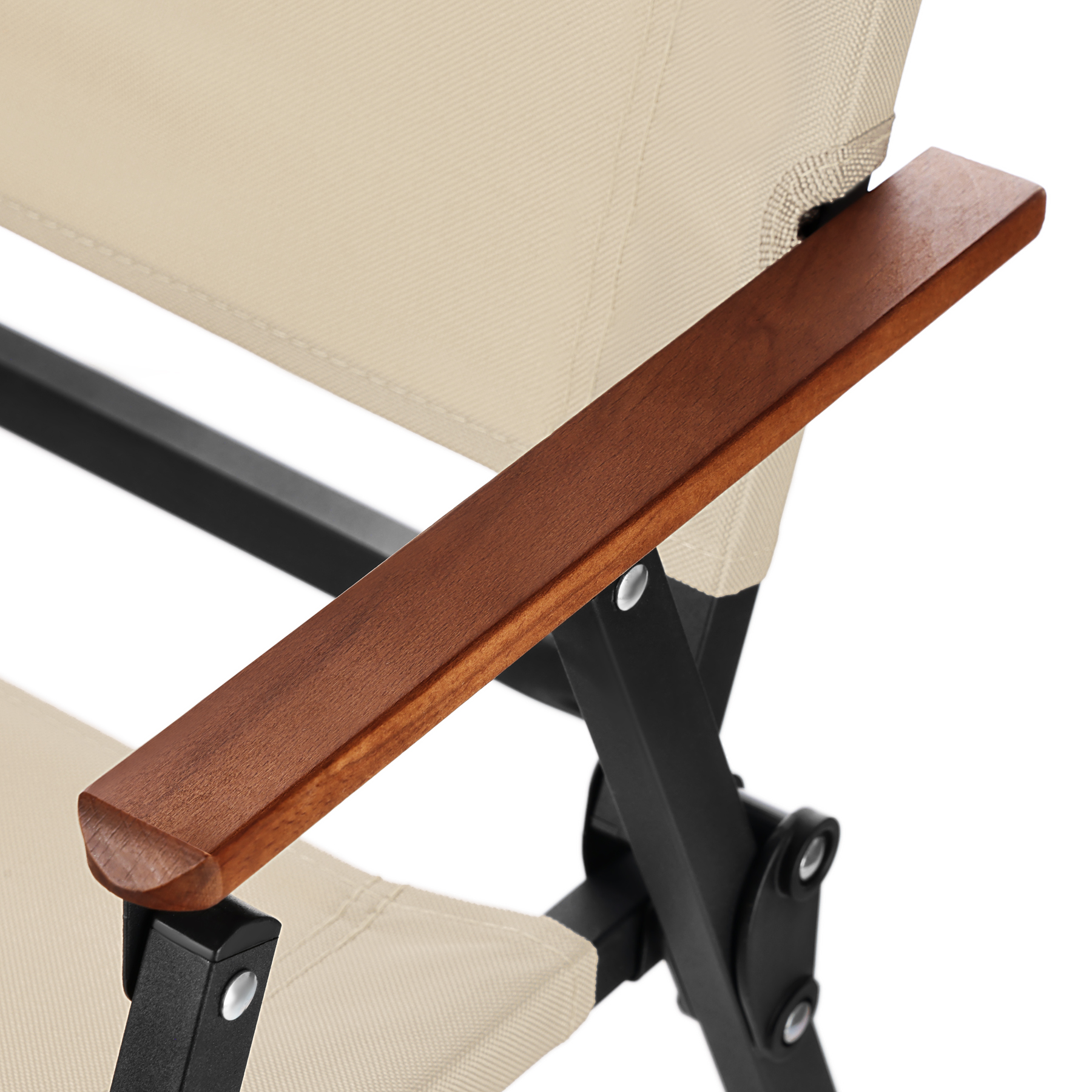Drewniane elementy wykończenia dodają całości stylu i sprawiają, że krzesło prezentuje się estetycznie zarówno w ogrodzie, jak i w strefach glampingowych. Konstrukcję oparto na solidnym stelażu z żelaza, a jego powierzchnia została zabezpieczona poprzez malowanie proszkowe. Taka powłoka zwiększa odporność na codzienne użytkowanie i pomaga zachować estetyczny wygląd przez dłuższy czas, co podkreśla wysoką jakość wykonania. Siedzisko wykonano z wytrzymałego poliestru 900D. Materiał o grubszym splocie jest znany z bardzo dobrej odporności na ścieranie oraz rozdarcia, dzięki czemu krzesło dobrze sprawdza się w warunkach plenerowych i przy częstym składaniu oraz rozstawianiu.