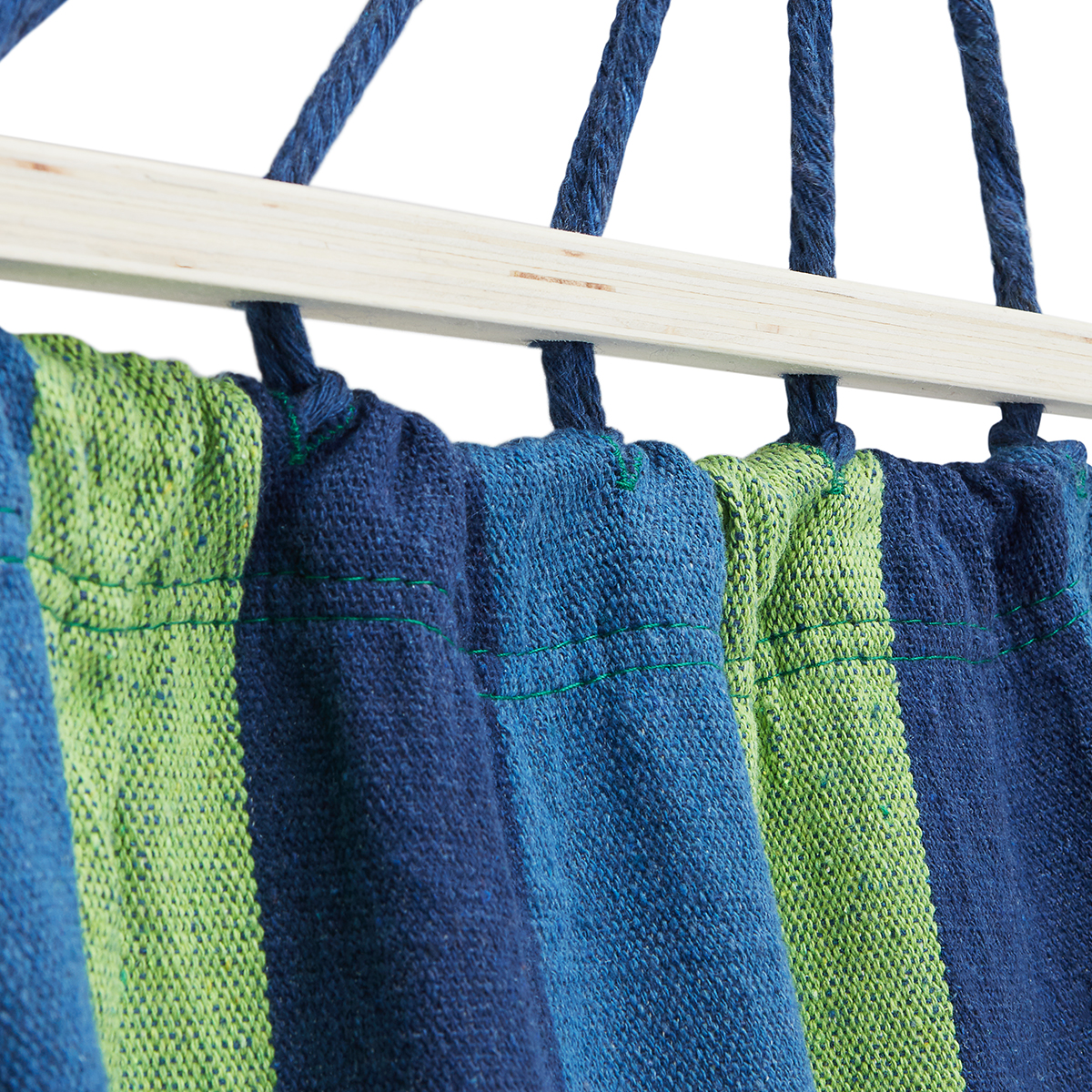 To hamak, przeznaczony do zawieszenia np. między dwoma drzewami. Łatwy w montażu, wszystkie niezbędne przybory, znajdują się w zestawie. Już po kilku chwilach, będziemy mogli oddać się, błogiemu odpoczynkowi. Drewniana belka o długości 70 cm, umieszczona w hamaku jako wzmocnienie sprawia, że materiał nie będzie się naciągał, przez co jego sprężystość będzie cały czas na takim samym, wysokim poziomie. Dzięki temu, będziemy odczuwali komfort użytkowania, przez wiele sezonów. Hamak idealnie dopasuje się naszego ciała, a szerokość aż 100 cm gwarantuje każdemu, znalezienie wygodnej pozycji. Materiał hamaka, to poliester oraz przyjemna, gęsto pleciona bawełna. Takie połączenie, daje bardzo wysoką wytrzymałość oraz odporność, na jakiekolwiek odkształcenie.