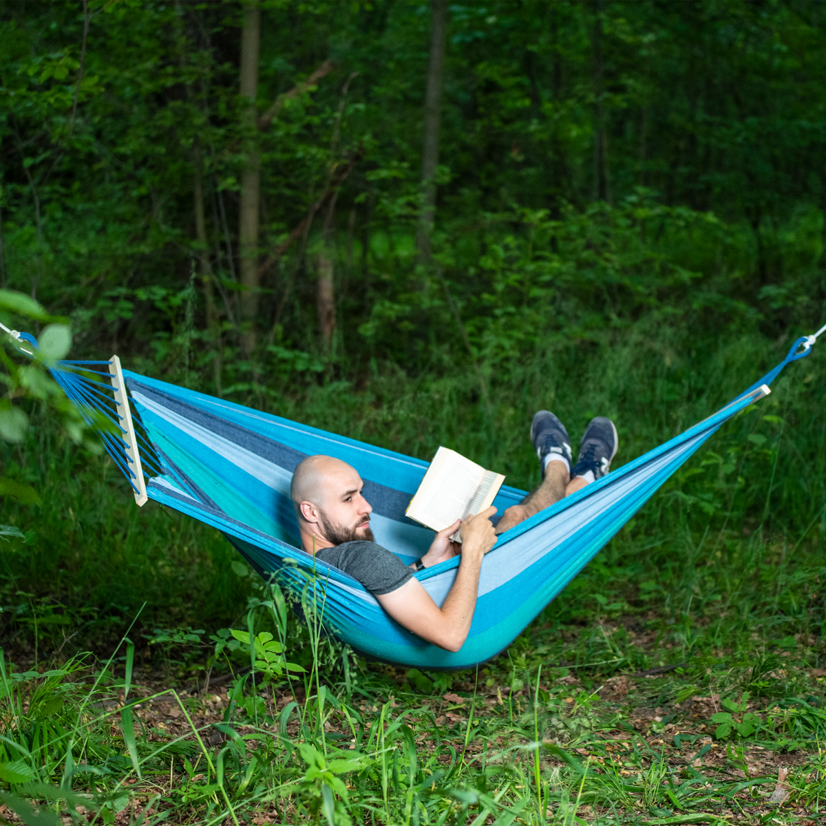 To hamak, przeznaczony do zawieszenia np. między dwoma drzewami. Łatwy w montażu, wszystkie niezbędne przybory, znajdują się w zestawie. Już po kilku chwilach, będziemy mogli oddać się, błogiemu odpoczynkowi. Drewniana belka o długości 70 cm, umieszczona w hamaku jako wzmocnienie sprawia, że materiał nie będzie się naciągał, przez co jego sprężystość będzie cały czas na takim samym, wysokim poziomie. Dzięki temu, będziemy odczuwali komfort użytkowania, przez wiele sezonów. Hamak idealnie dopasuje się naszego ciała, a szerokość aż 150 cm gwarantuje każdemu, znalezienie wygodnej pozycji. Materiał hamaka, to poliester oraz przyjemna, gęsto pleciona bawełna. Takie połączenie, daje bardzo wysoką wytrzymałość oraz odporność, na jakiekolwiek odkształcenie.