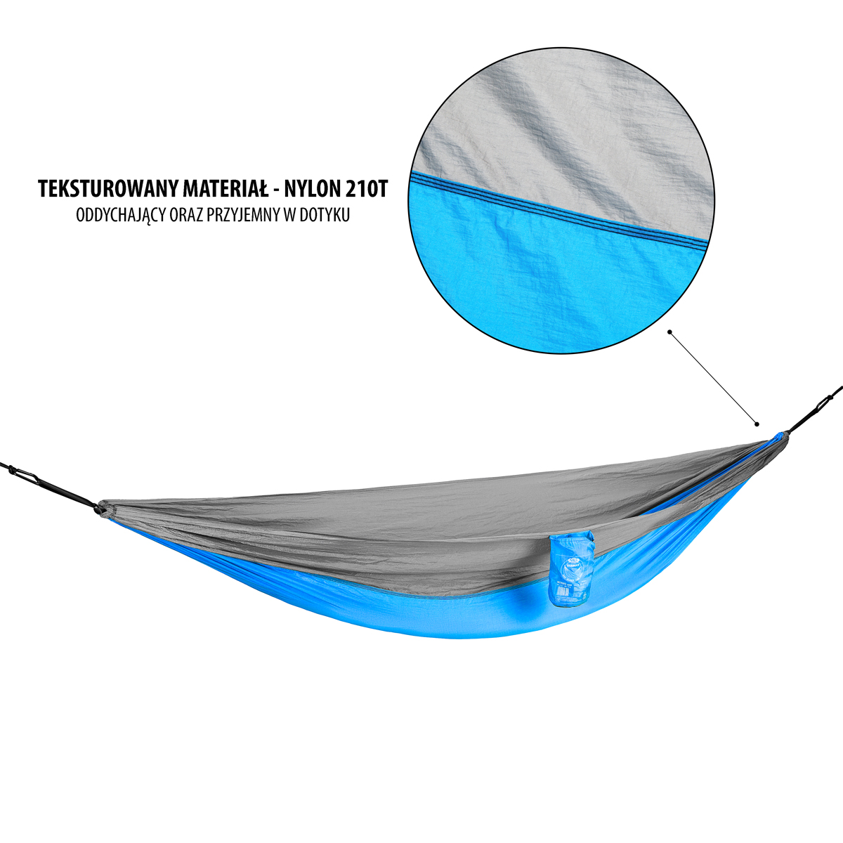 Materiał hamaka to nylon 210T. Jest nie tylko bardzo wytrzymały, ale i przyjemny w dotyku. Jego oddychająca struktura, zapewnia komfort w trakcie odpoczynku oraz sprawia, że hamak jest szybkoschnący. Materiał jest odporny na warunki atmosferyczne oraz jakiekolwiek odkształcenia.