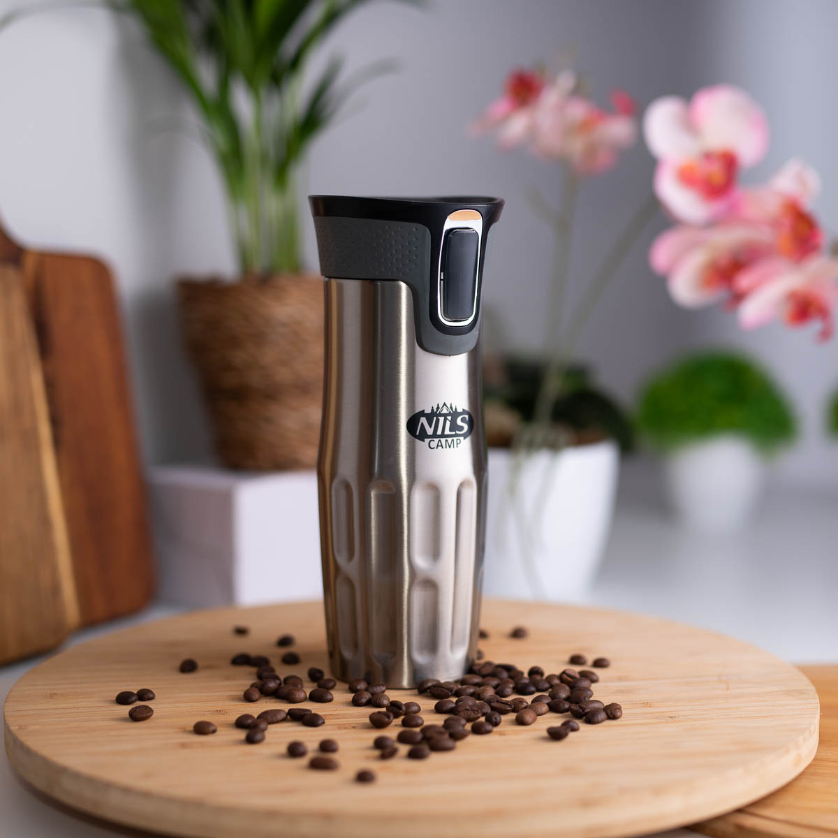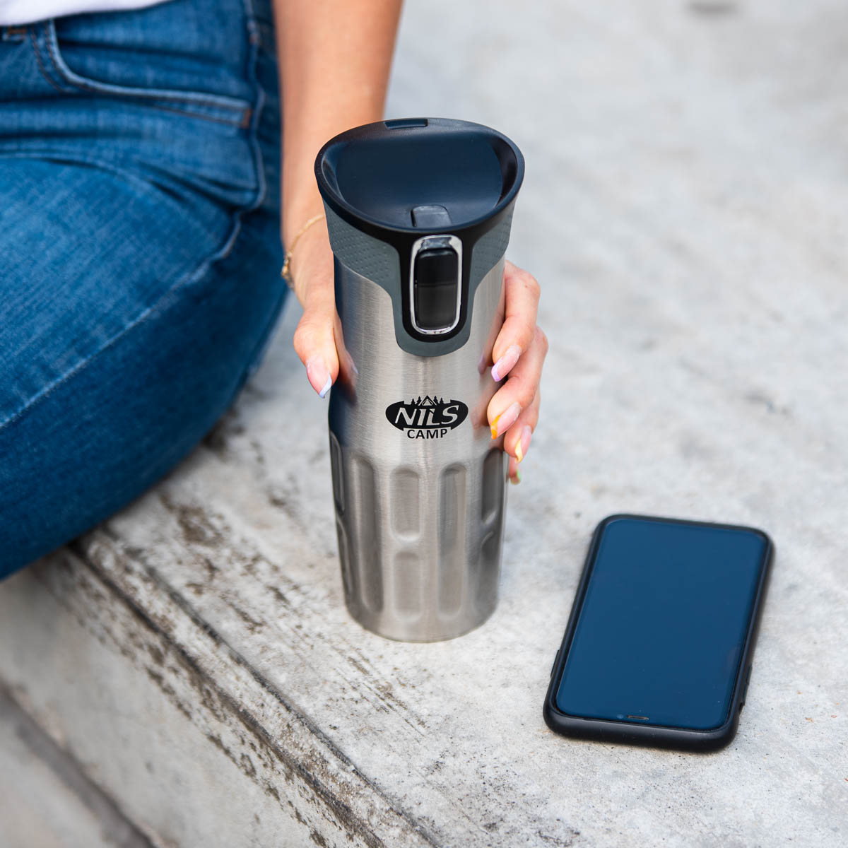Kubek termiczny NCC06 marki Nils Camp cechuje zarówno prosta konstrukcja jak i oryginalny design! NCC06 to kubek termiczny, który wykonany jest ze stali nierdzewnej o podwójnej ściance, dzięki czemu gwarantuje utrzymanie temperatury ciepłych napoi przez 12 godzin, a zimnych przez 24 godziny. Kubek termiczny NCC06 posiada innowacyjny system otwierania. Aby móc się napić, należy wcisnąć i trzymać przycisk – wtedy blokada otworu się zwalnia. Natomiast, żeby zablokować otwór, wystarczy zwolnić przycisk. Kubek posiada również tłoczenia w części chwytnej, co ułatwia jego trzymanie i zwiększa bezpieczeństwo podczas przemieszczania się. Dużym atutem jest również to, że dolna część kubka posiada antypoślizgową gumę, co zwiększa bezpieczeństwo przed rozlaniem gorącej kawy czy herbaty podczas gdy kubek jest otwarty!