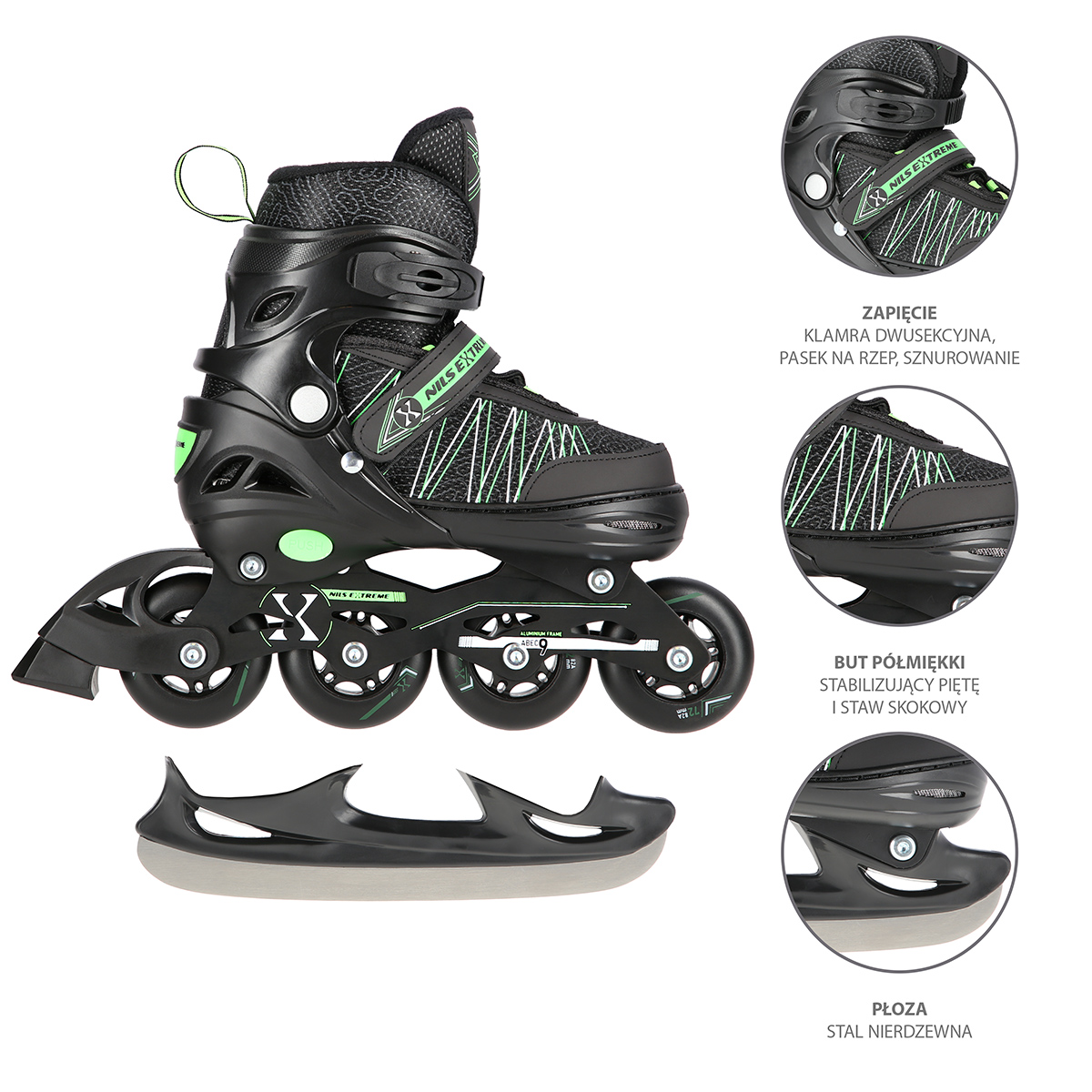 NH11912 Nils Extreme to łyżwy przeznaczone dla pasjonatów jazdy. Produkt oferuje 2 możliwości konfiguracji, są to: łyżwy, łyżworolki.
