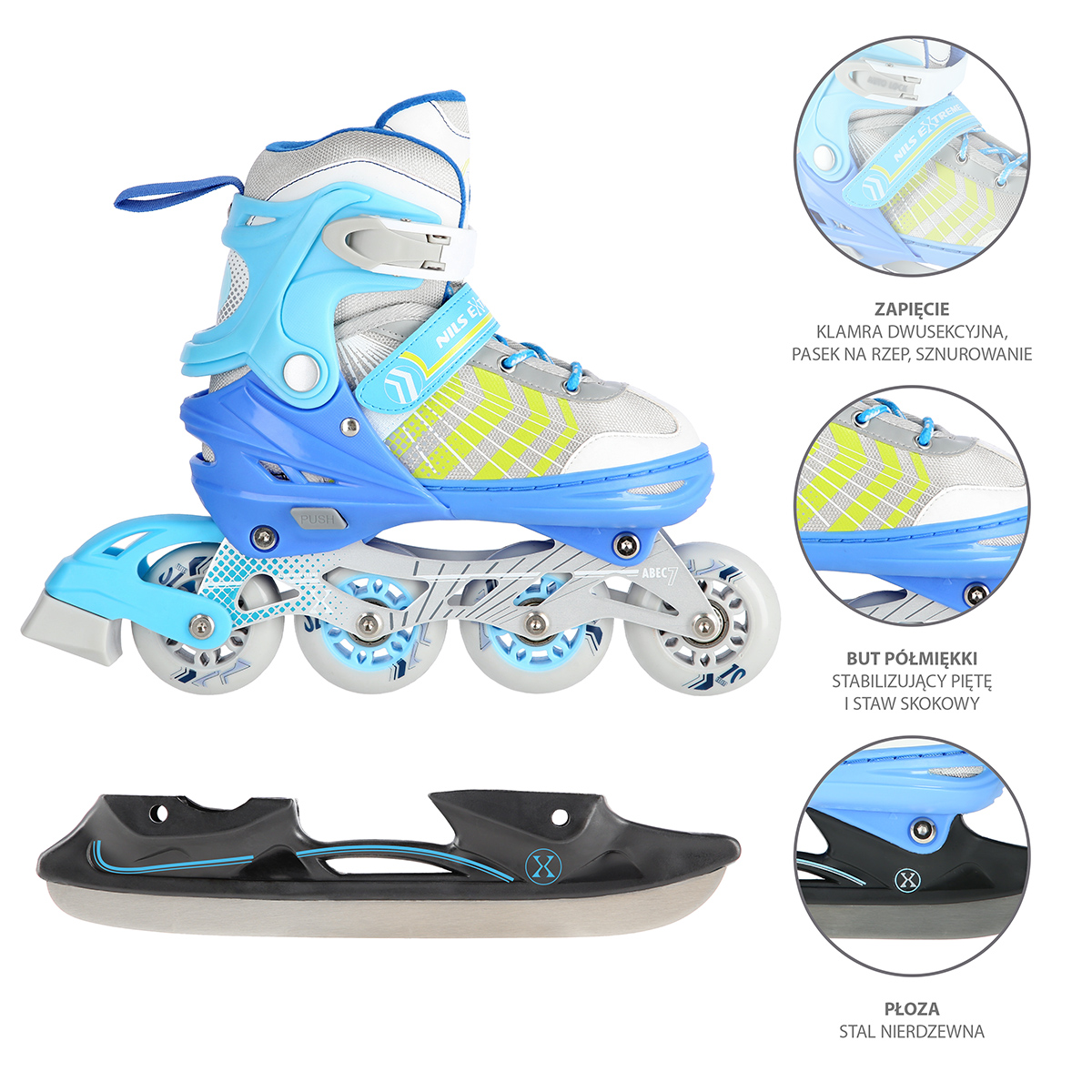 NH18192 Set Nils Extreme, to produkt przeznaczony dla pasjonatów jazdy. Oferuje 4 możliwości konfiguracji. Są to: łyżwy, łyżworolki, wrotki oraz rolko-wrotki.