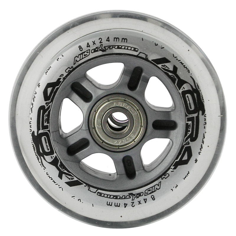 Kółka PU CLEAR NILS EXTREME są wykonane z poliuretanu. Najważniejszymi parametrami kółek są twardość oraz średnica. Twardość kółek decyduje zarówno o komforcie jazdy jak i o przyczepności do podłoża. Kółka PU-82A zapewniają dobrą amortyzację oraz doskonałą adaptację do każdej nawierzchni. Średnica kółek ma bezpośredni wpływ na szybkość jazdy. Kółka o większej średnicy umożliwiają osiąganie większych prędkości, jednak nie gwarantują tak dużej manewrowości jak kółka o mniejszej średnicy. Łożysko ABEC 7, wykonane z wysokiej jakości stali chromowanej, które zapewnia doskonałą twardość i wytrzymałość. Charakteryzuje się najniższym oporem toczenia co przekłada się na największą prędkość w amerykańskiej normie Annular Bearing Engineering Committee w skrócie ABEC. Istotnym parametrem tego łożyska jest mimośrodowość czyli okrągłość na torze w pierścieniu wewnętrznym i wynosi zaledwie 0,0025mm.