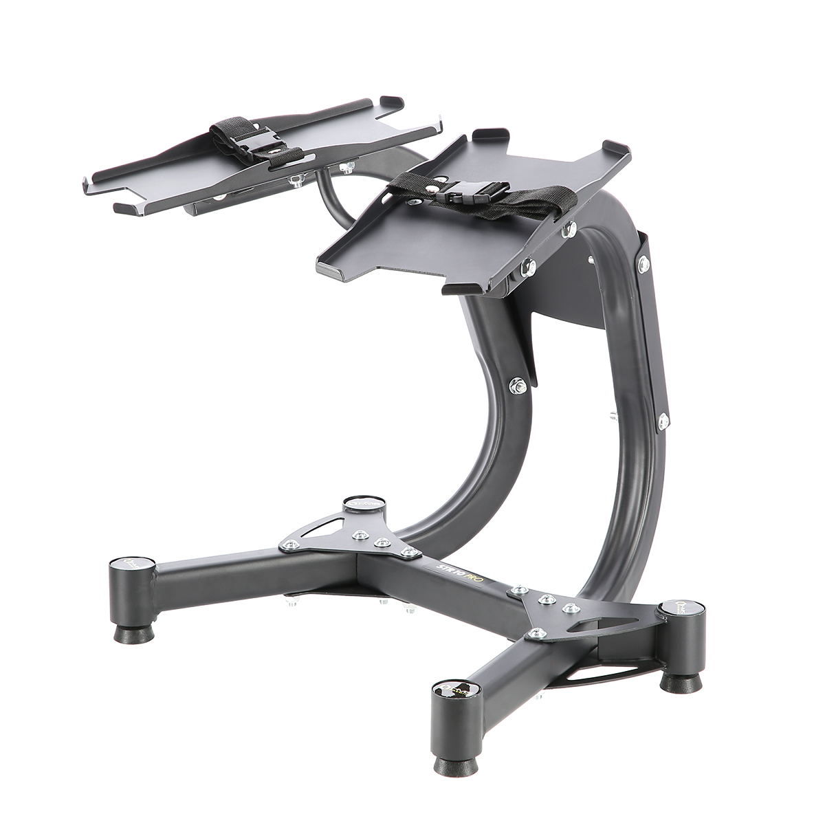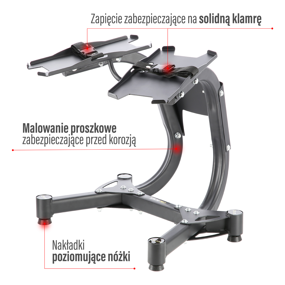 Paski zamontowane w stojaku oraz wyprofilowane końcówki miejsca na obciążenie zapobiegają zsunięciu się hantli.