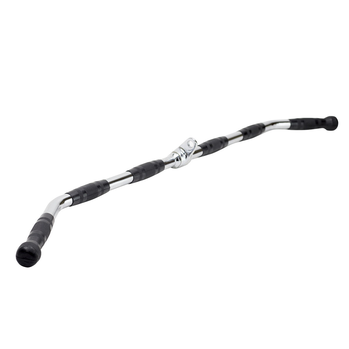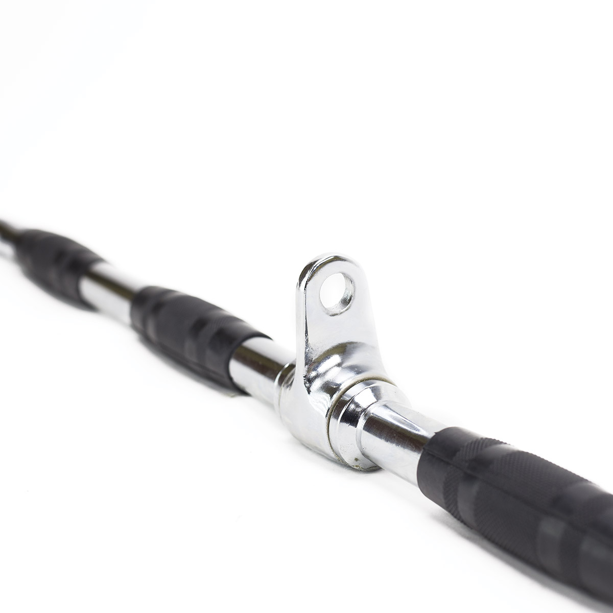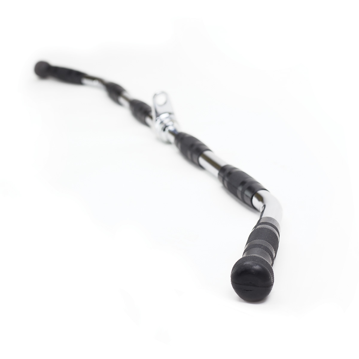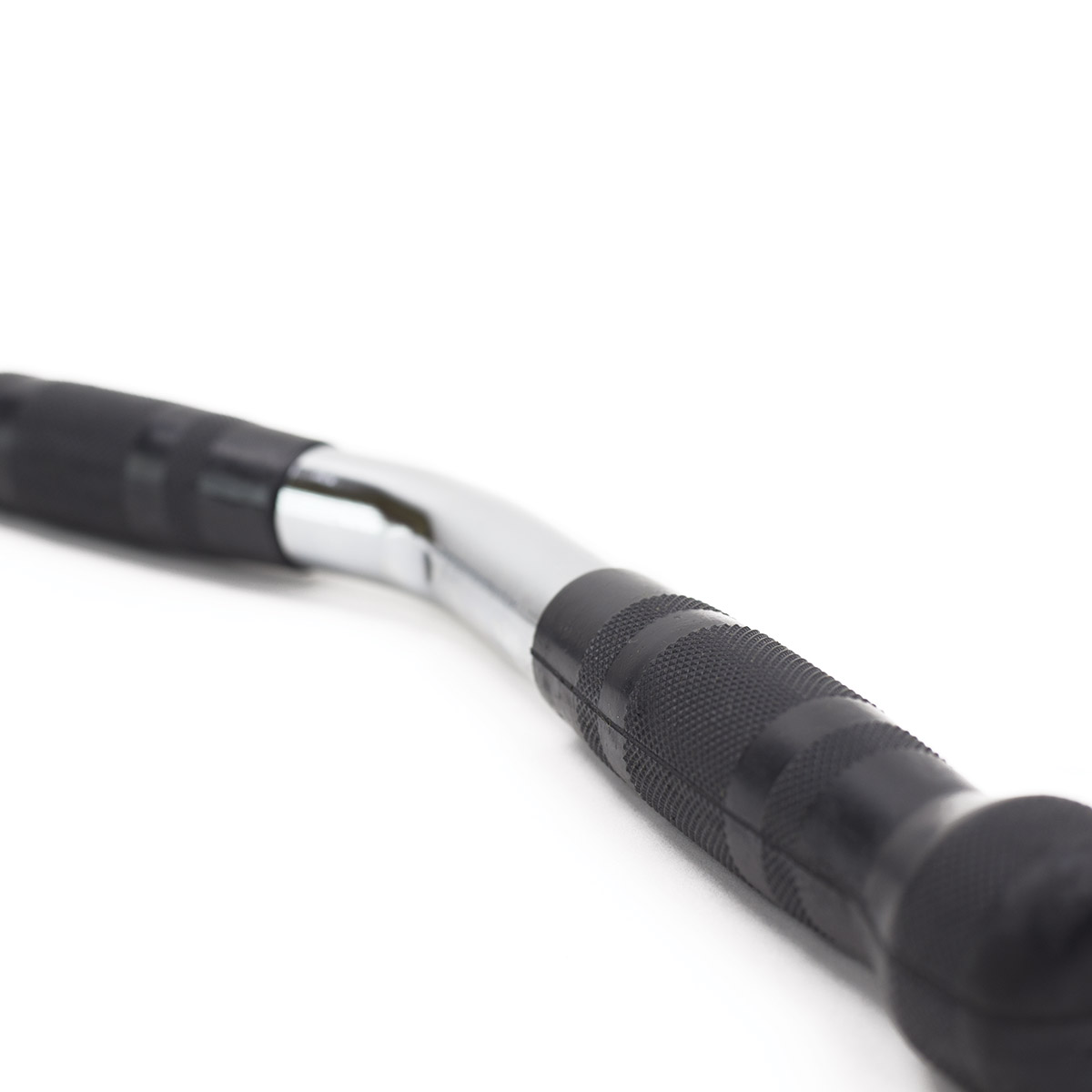 Wykonany jest z wysokiej jakości stali, co umożliwia trening ze znacznym obciążeniem. Jego długość oraz ilość ogumowanych rękojeści gwarantuje wiele możliwości chwytu, od bardzo wąskiego do bardzo szerokiego. Dzięki temu uchwyt umożliwi, przy każdym ćwiczeniu, rozwinięcie mięśni na różnych długościach ich przyczepów. Skrajne rękojeści ustawione są pod kątem, co przy ćwiczeniu ściągania drążka na wyciągu górnym, sprzyja przyciąganiu łokci do tułowia, czyli utrzymaniu najlepszej techniki ćwiczenia. Uchwyt umożliwia dokładne wykonywanie treningu, bez obaw przed wyślizgnięciem się z rąk. Zapewniają to ogumowane rękojeści, które zapewniają również pewny i komfortowy chwyt.