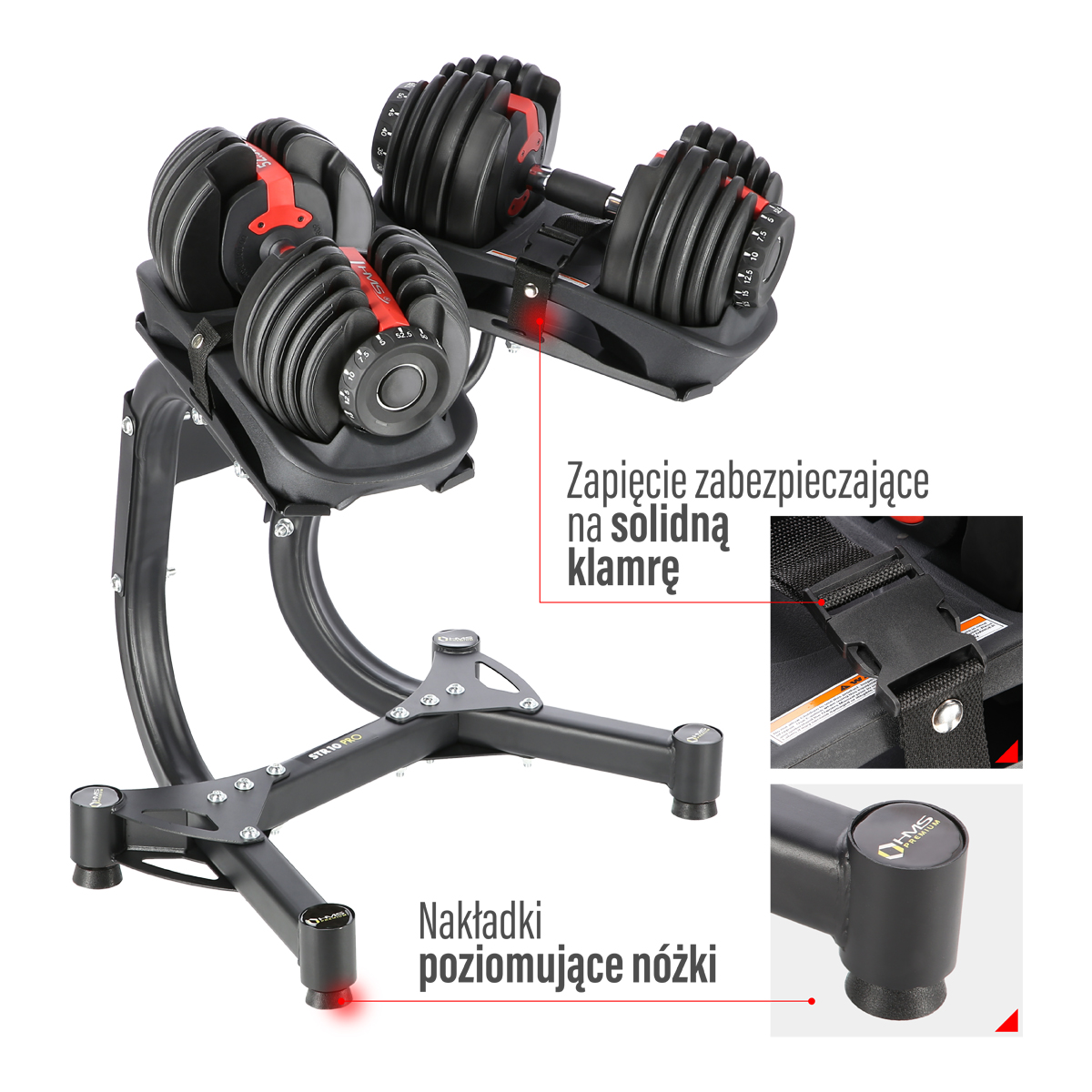 Sztangielka regulowana HMS SR52 to przyrząd będący idealnym rozwiązaniem dla osób ćwiczących w domu. Innowacyjny, talerzowy system montowania obciążeń umożliwia bardzo szybką i łatwą ich zmianę. W przeciwieństwie do uciążliwej zmiany talerzy w zwykłych hantlach, SR52 wystarczy odłożyć na podstawkę i ustawić pokrętłami pożądane obciążenie. Teraz gdy podniesiemy sztangielkę, będą do niej przymocowane talerze odpowiadające nowo ustawionemu obciążeniu. Sztangielka SR52 wykonana została z najwyższej jakości materiałów. Ergonomiczna, profilowana rękojeść pokryta materiałem antypoślizgowym pozwoli uzyskać pewny i mocny chwyt. STR10 HMS PREMIUM to stalowy stojak na sztangielki regulowane. Jego ergonomiczny kształt pozwala na komfortowe podniesienie i odłożenie sztangielek. Paski zamontowane w stojaku oraz wyprofilowane końcówki miejsca na obciążenie zapobiegają zsunięciu się hantli. STR10 to świetne rozwiązanie dla posiadaczy sztangielek regulowanych.