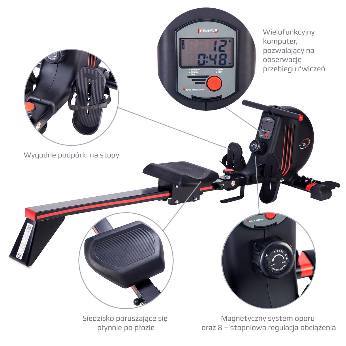 Wioślarz ZM1502 HMS jest nowoczesnym przyrządem do kompleksowego rozwijania górnych i dolnych partii mięśniowych. Produkt został wyposażony w magnetyczny system oporu oraz 8 – stopniową regulację obciążenia. ZM1502 HMS wykonano z materiałów najwyższej jakości gwarantujących bezpieczeństwo użytkowania. Masywna stalowa konstrukcja i wytrzymały system linowy to idealne połączenie. Umożliwia ono na długi, a zarazem intensywny trening. Przyrząd posiada wielofunkcyjny komputer, który pozwala na obserwację przebiegu ćwiczeń – począwszy od liczby wykonanych powtórzeń, kończąc na spalonych kaloriach. Wioślarz został wyposażony w wygodne podpórki na stopy oraz siedzisko poruszające się płynnie po płozie. Produkt umożliwia również podłączenie pasa telemetrycznego. ZM1502 HMS pozwala na przeprowadzenie kompleksowych ćwiczeń wytrzymałościowych (cardio). Wioślarz idealnie sprawdzi się jako narzędzie do wzmocnienia i rozciągnięcia wielu grup mięśni, m.in. pleców, ramion, nóg pośladków, brzucha oraz lędźwi. Trening przy jego wykorzystaniu poprawia wydolność systemu sercowo-naczyniowego, wspomaga spalanie tłuszczu i zwiększa zdolność organizmu do przyswajania tlenu.